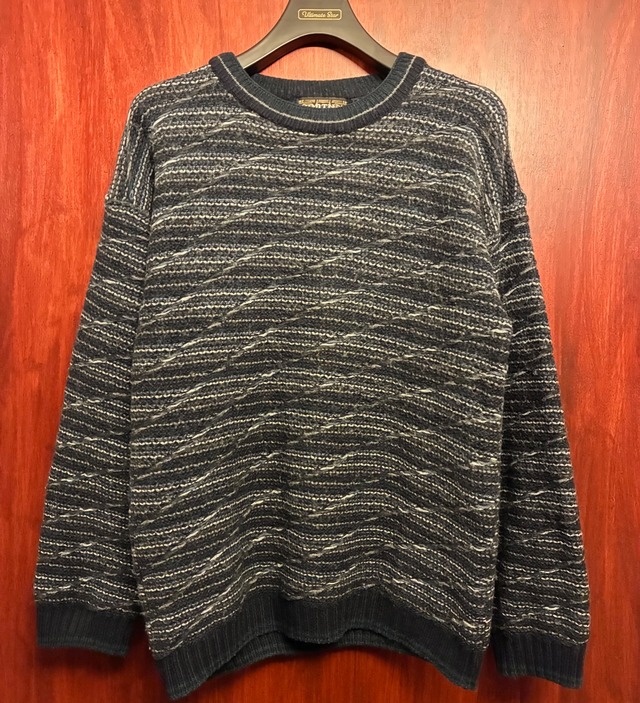 【商品説明】 こちらはイタリア製のCORTINA ITALIA(コルティナ・イタリア)のクルーネックセーターです。 3Dニットセーターと呼ばれる立体編みセーターのような斜めに入ったデザインがアクセントになったオシャレなおすすめの一品です。 VINTAGE SELECTION取り扱い商品は、年代物の古着商品の為、色落ちや薄シミなどがある場合がございますので古着にご理解の上ご購入をお願い致します。 写真によって色合いが多少異なって見えますが撮影上の光の加減になりますので、色合いが気になる方は店舗にて現物を確認いただくようお願い致します。 【状態】AB(やや美品) 【色】ネイビー 【素材】アクリル70%、ウール30% 【生産国】イタリア 【サイズ】M(詳細は下記参照下さい。) 着丈:60cm(前襟縫い目下から裾まで) 68cm(後ろ襟下縫い目から裾まで) 肩幅:62cm 身幅:58cm 袖丈:54cm ※ハンガーにかけた状態の寸法の為、多少の誤差はご了承ください。