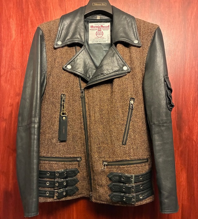 激レア MADE IN UK製 90s Harris Tweed 本革 レザーコンビ ダブルライダースジャケット ブラウン×ブラック Mサイズ
