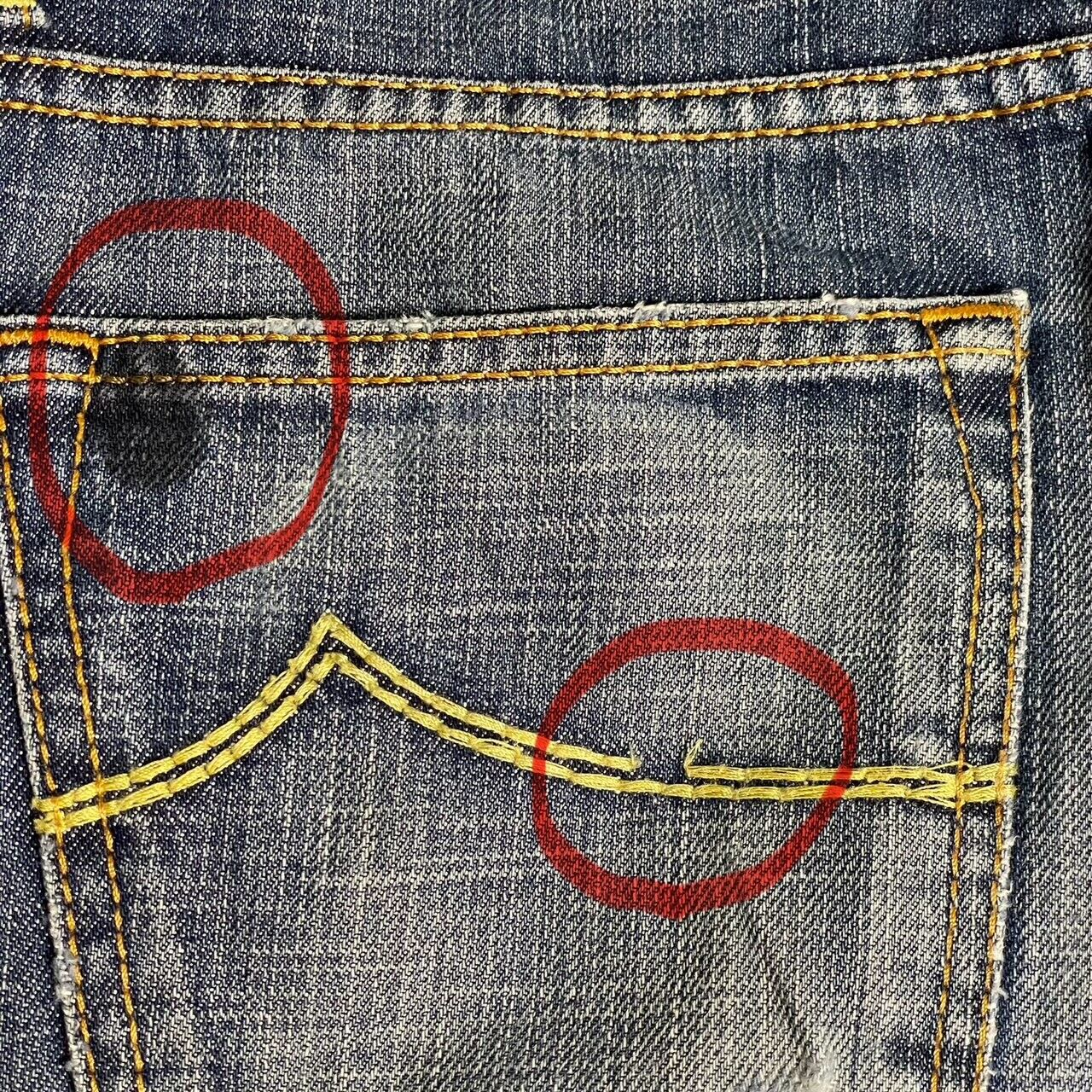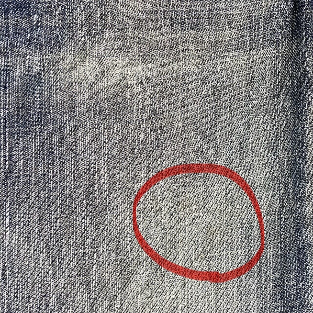 左もも付近に薄シミや左バックポケットにシミやステッチ切れがある為、お求めやすい価格での販売となります。