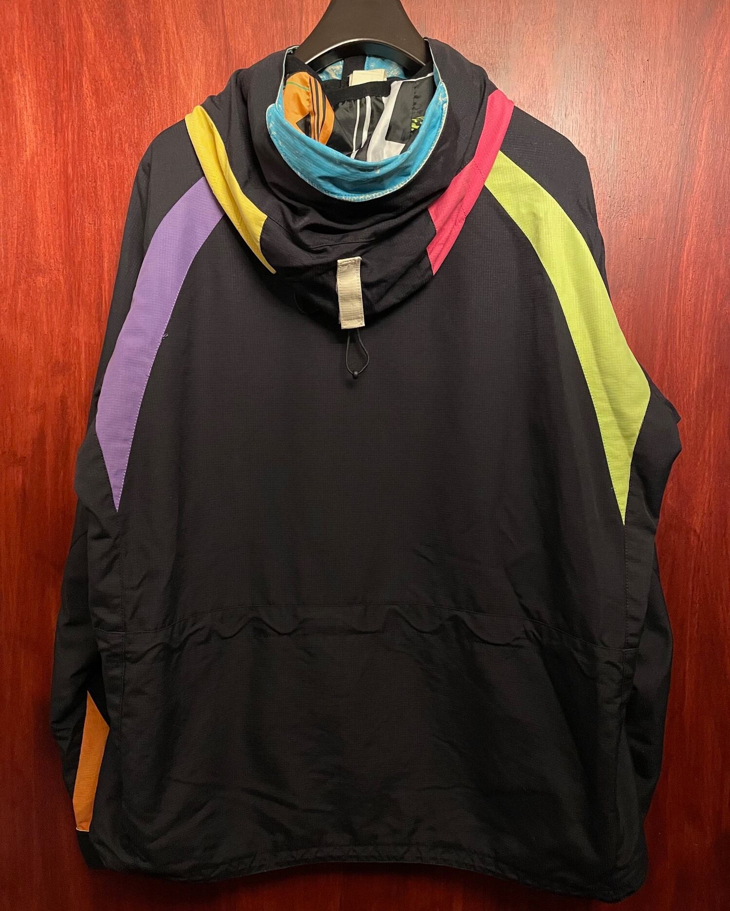 ネオンカラーの異なる色合いの生地を切り返しに使っており、ポケットも多いので実用性がとても高く、ナイロン素材なのでちょっとした小雨や防風性もある機能性ジャケットです。