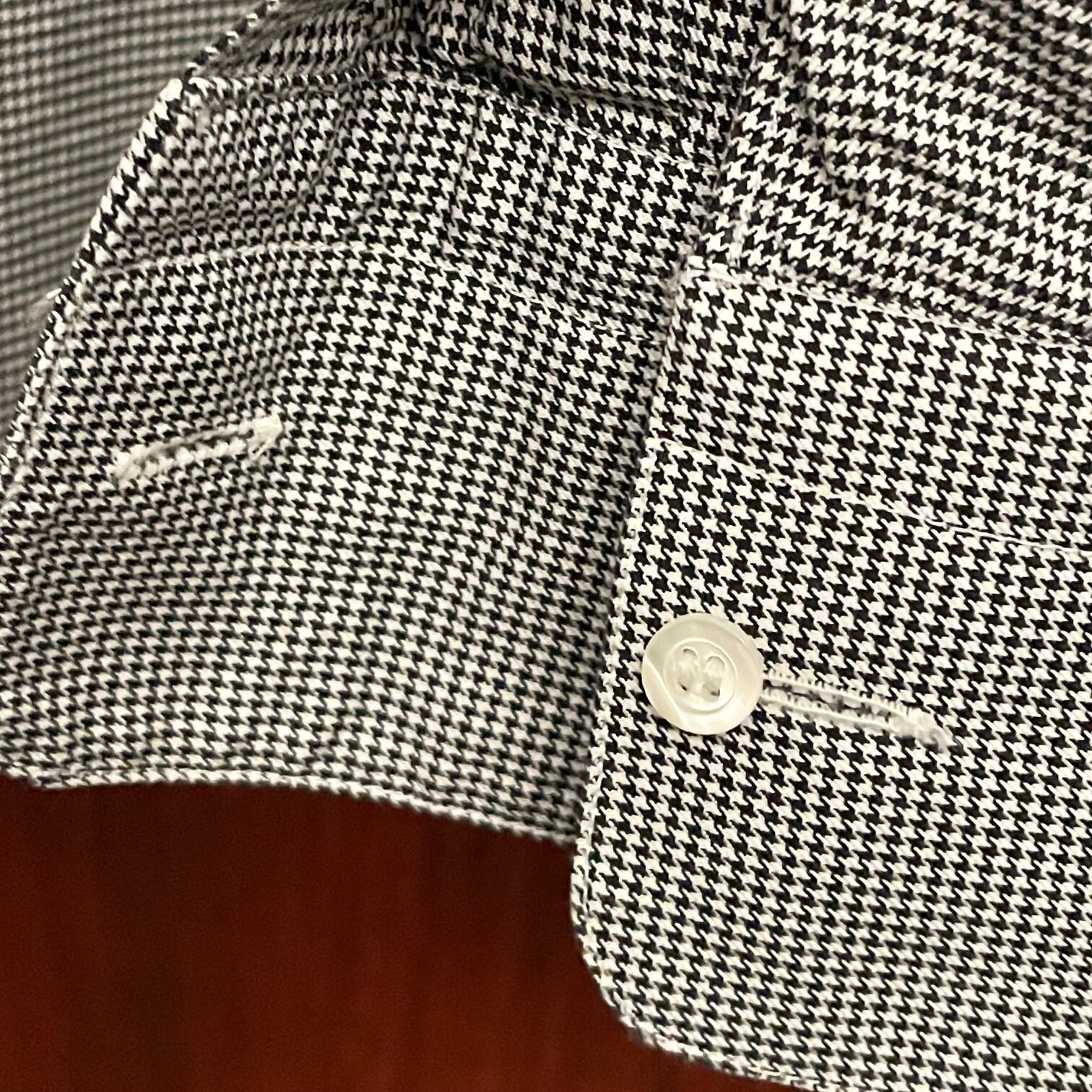 ギンガムチェックがよく見ると千鳥格子柄で作られており、カフスボタン部分にボタンホールが開いているので、ボタン留めだけでなくカフリンクスを付けることも可能です。