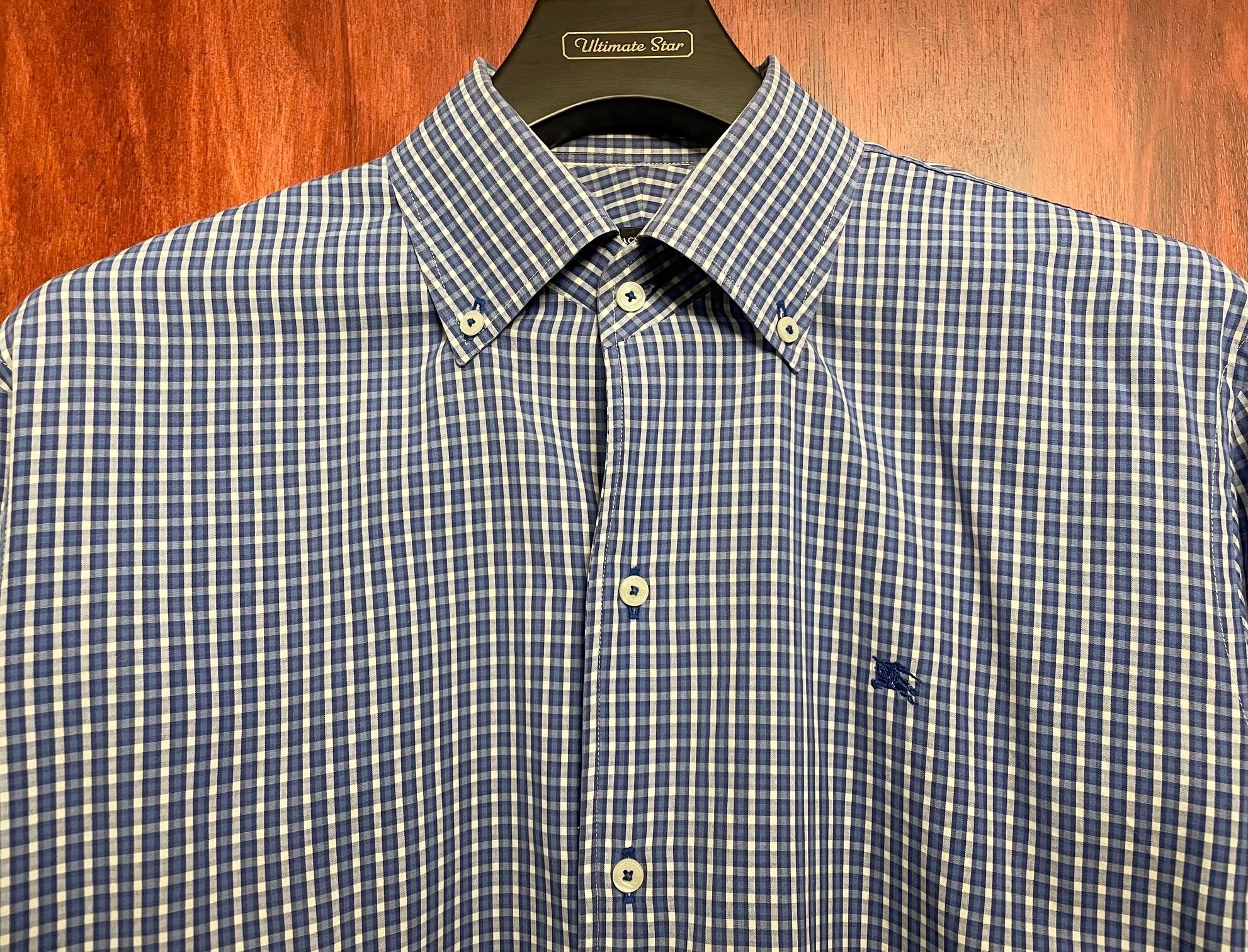 ブルーを基調としたギンガムチェック柄の生地に、左胸におなじみのバーバリーロゴが刺繍されており、ボタンダウン仕様ですがスキッパーのようなシルエットなのでノータイでもきれいに襟立ちするおすすめの一品です。