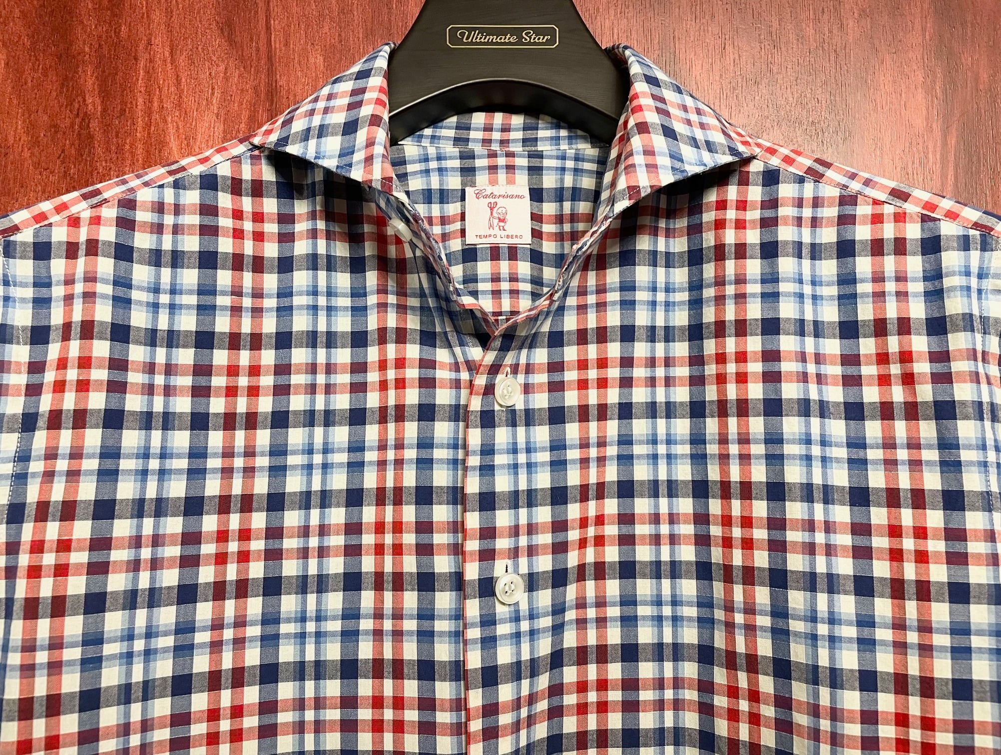 高級シャツブランドらしい上質な生地を使ったトリコロールと呼ばれるレッド、ブルー、ホワイトの3色カラーのギンガムチェック柄に、リネン素材を混紡したコットン素材なのでオールシーズン着用出来る汎用性の高いおすすめの一品です。