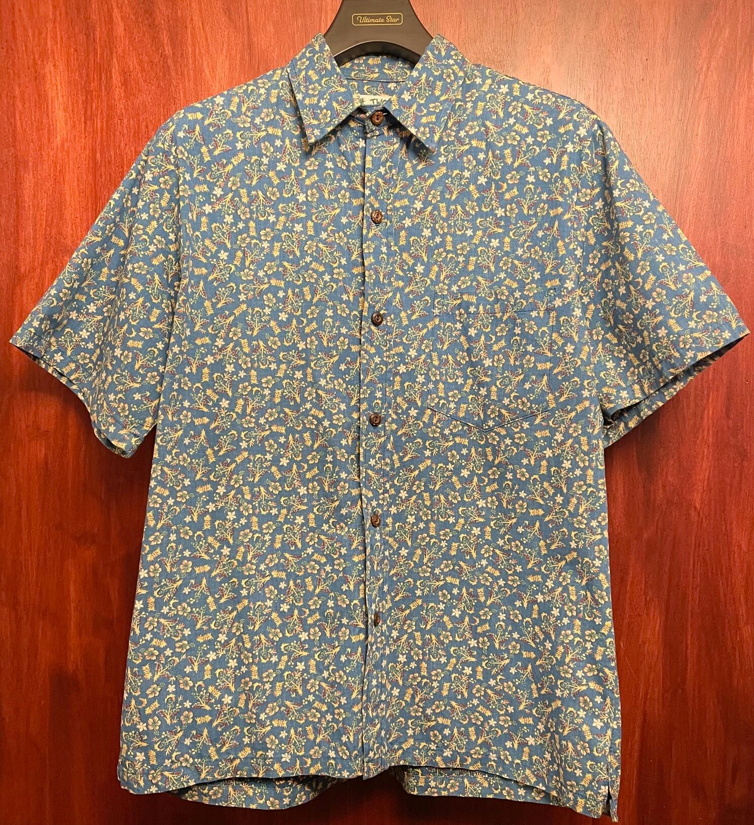 MADE IN HAWAII製 TWO PALMS アロハ柄 半袖コットンシャツ ブルー Mサイズ