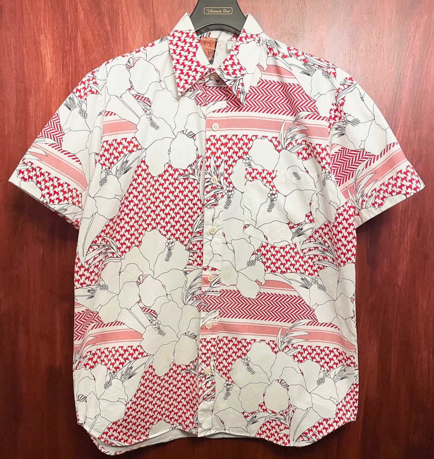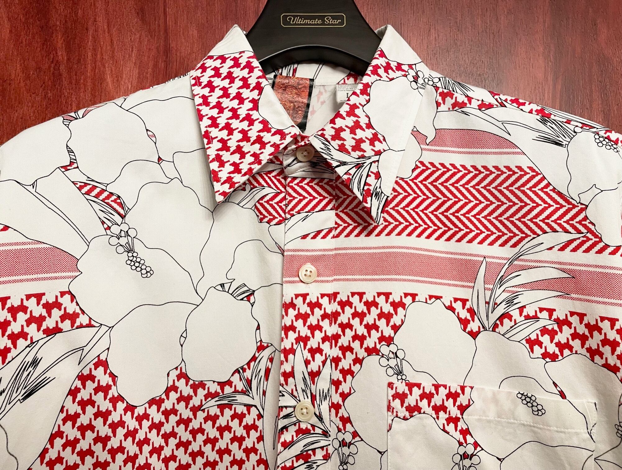 デザイナーのオオスミ氏がプライベートでもよく着用していたシュマグと呼ばれるアフガンストールの柄とボタニカル柄のアロハシャツを組み合わせたデザインで、あえて花などを白抜きにしてシュマグの赤を目立たせるというフェノメノンらしい遊び心溢れるオシャレなおすすめの一品です。