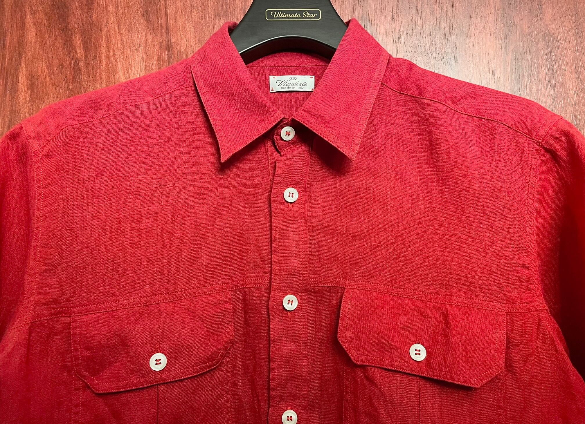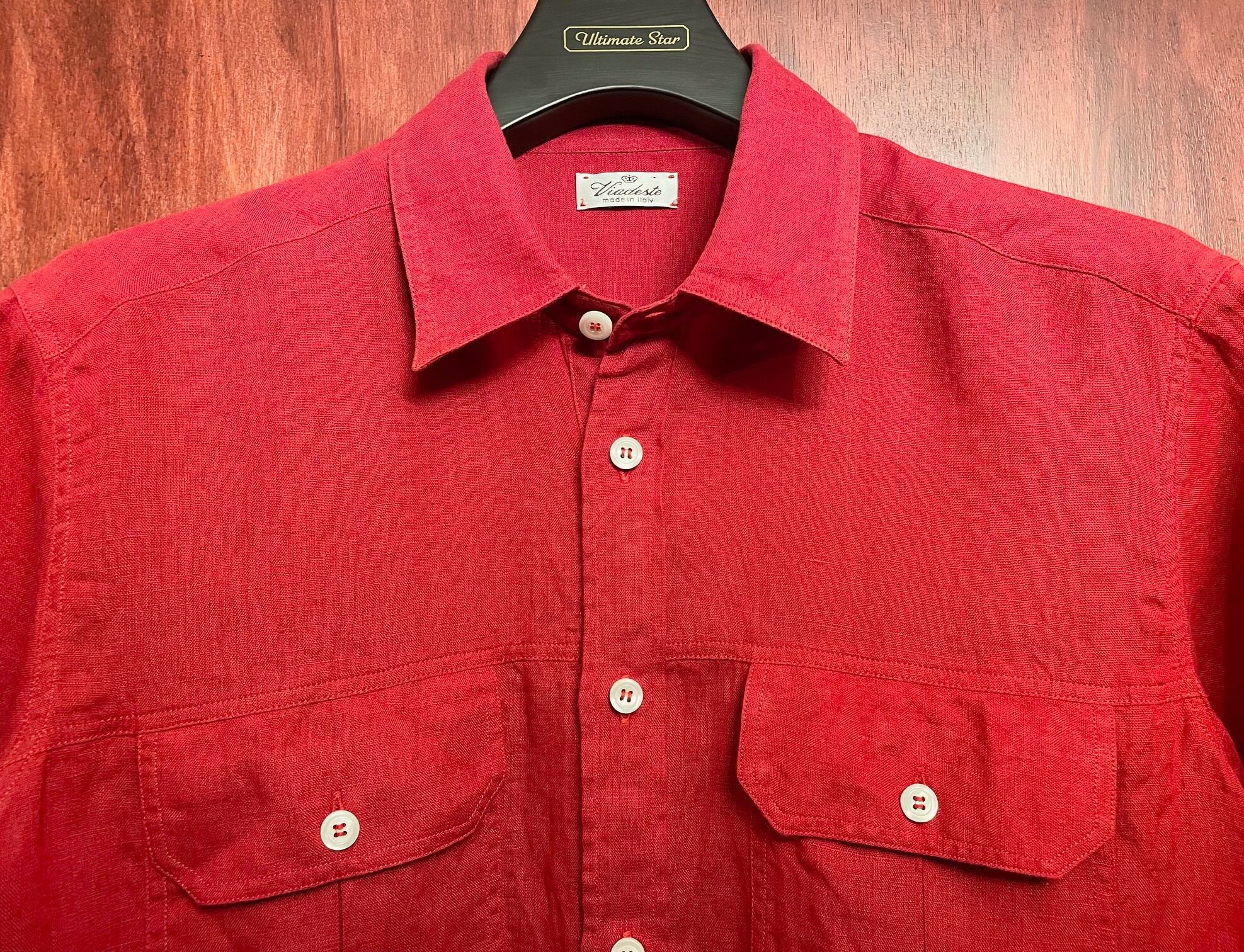 両胸がミリタリーシャツのようなフラップポケット仕様になっており、リネンシャツでは珍しいレッドカラーのオシャレなおすすめの一品です。