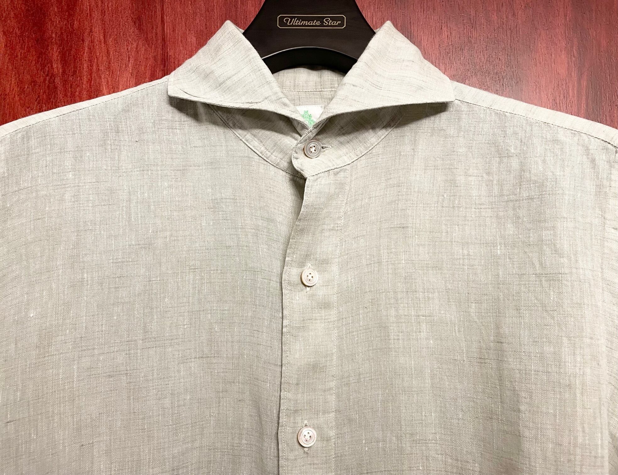上質なリネン素材を使っており、きれいなグレージュなカラーリングに無地のシンプルなデザインなので使い勝手の良いイタリアシャツらしいオシャレなおすすめの一品です。
