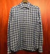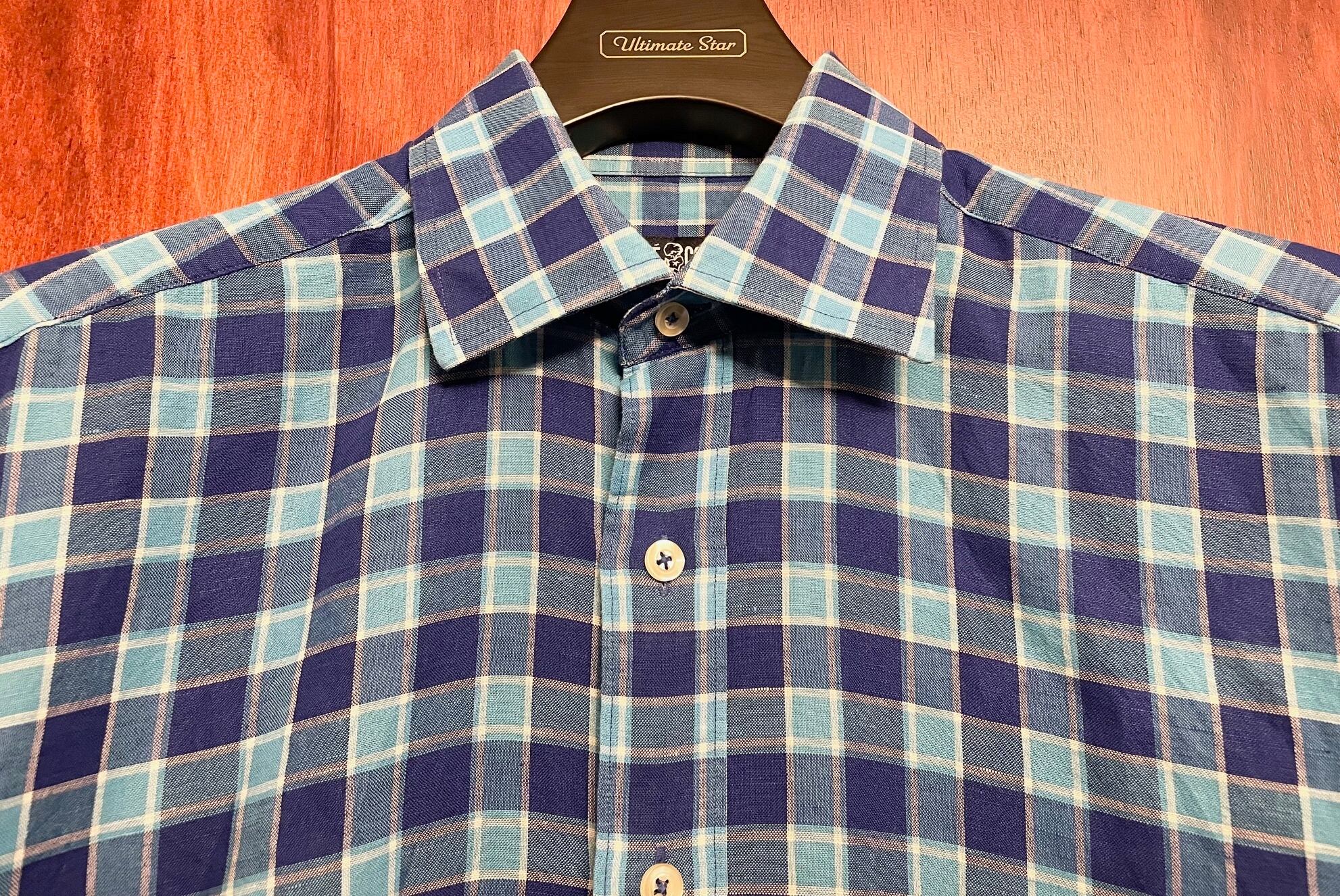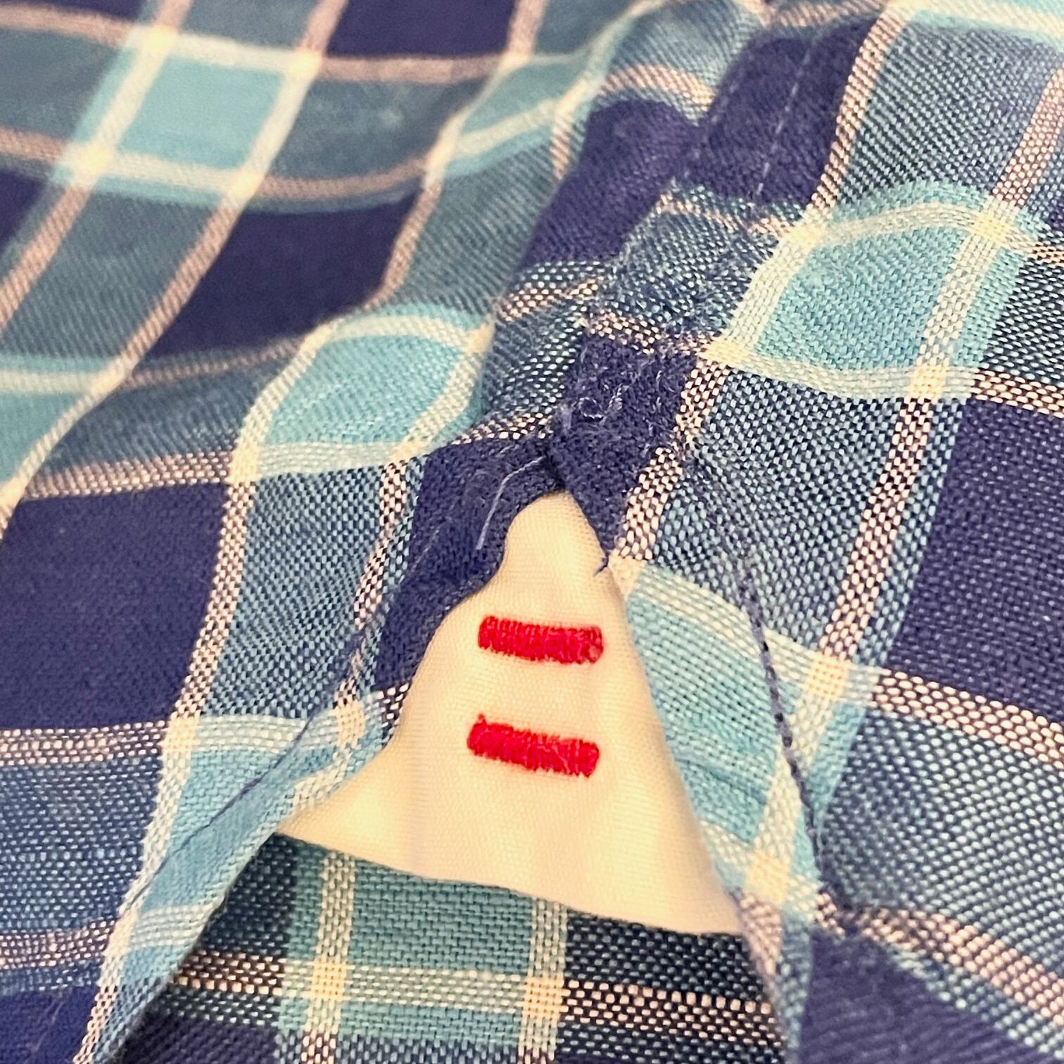 濃いめのブルーと薄めのブルーを組み合わせブロックチェック柄の上質なリネンコットン素材を使っており、袖口の赤のカンヌキやガゼットの赤のラインなど細部までこだわったオシャレなおすすめの一品です。