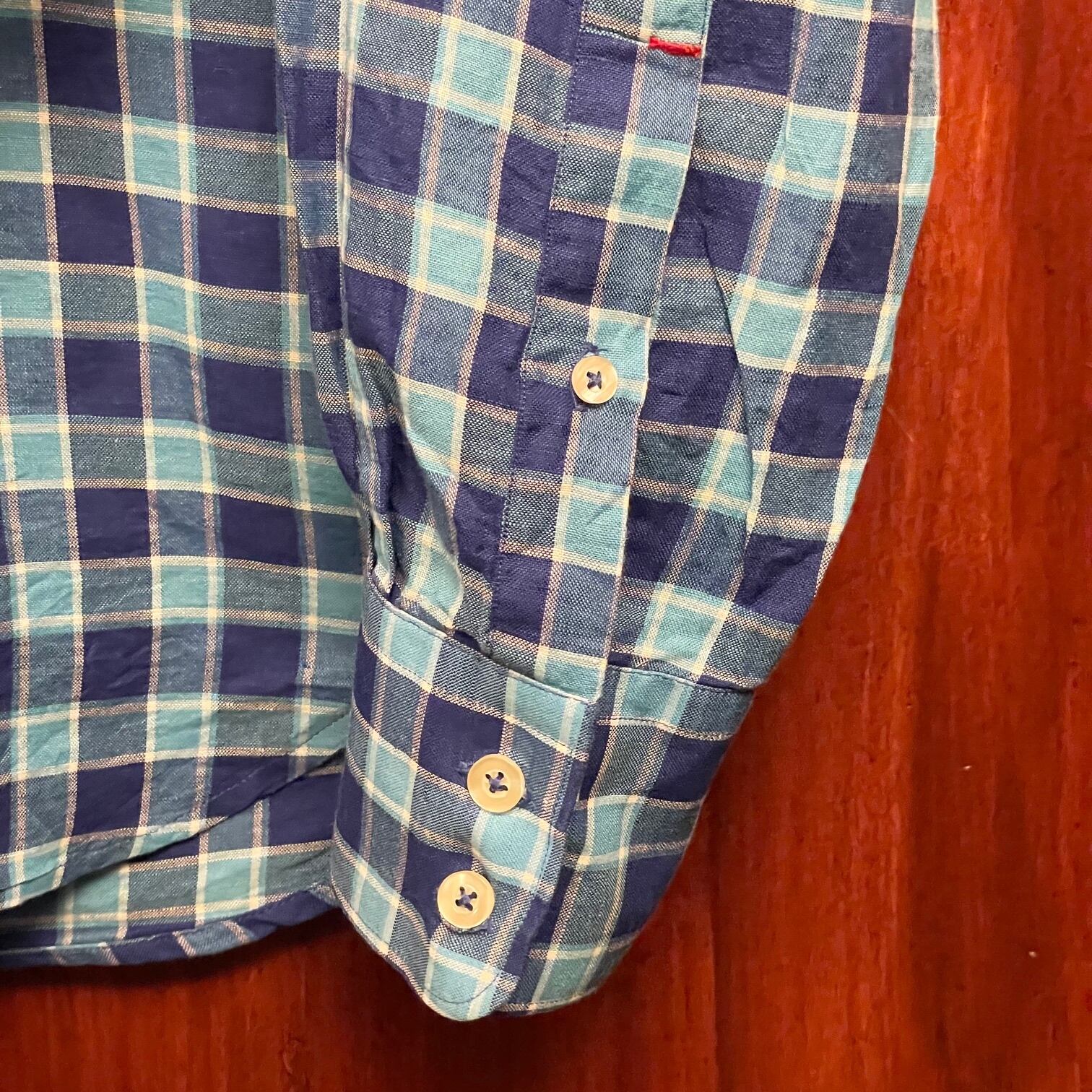 CAFÉ COTON ブロックチェック柄 長袖リネンコットンシャツ ブルー×ライトブルー Mサイズ