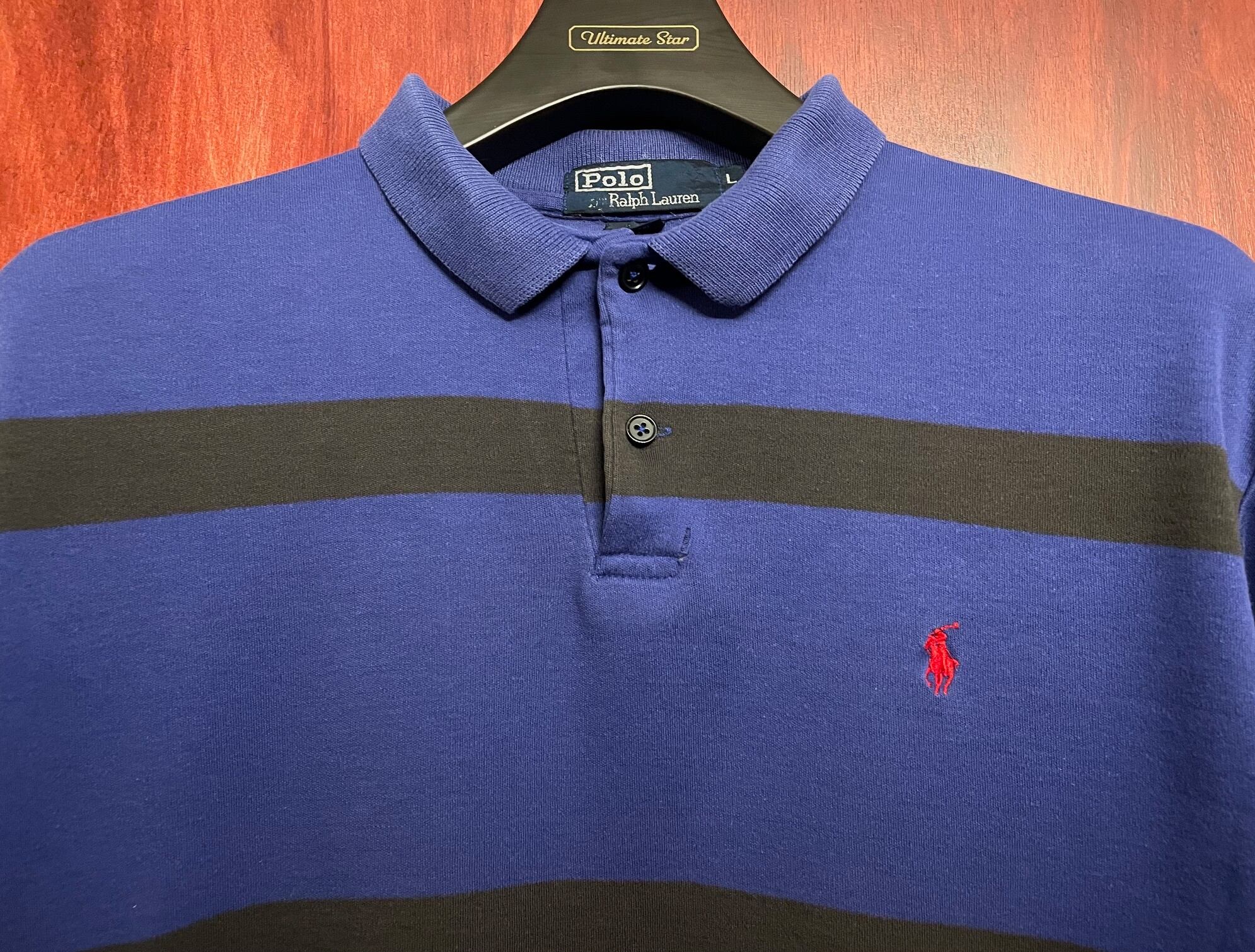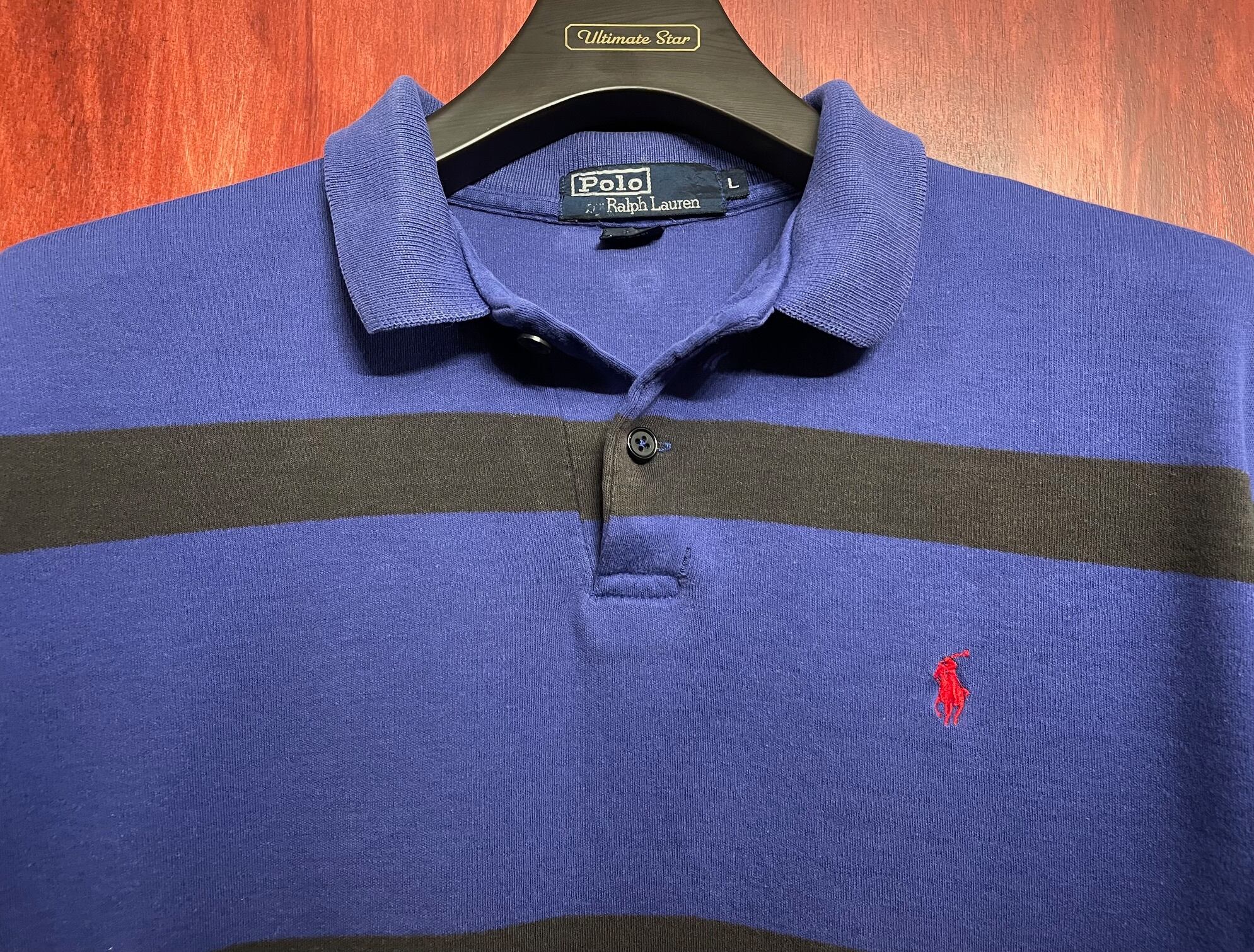 レア MADE IN USA製 Polo by Ralph Lauren ボーダー柄 半袖ニットポロシャツ ネイビーブルー Lサイズ