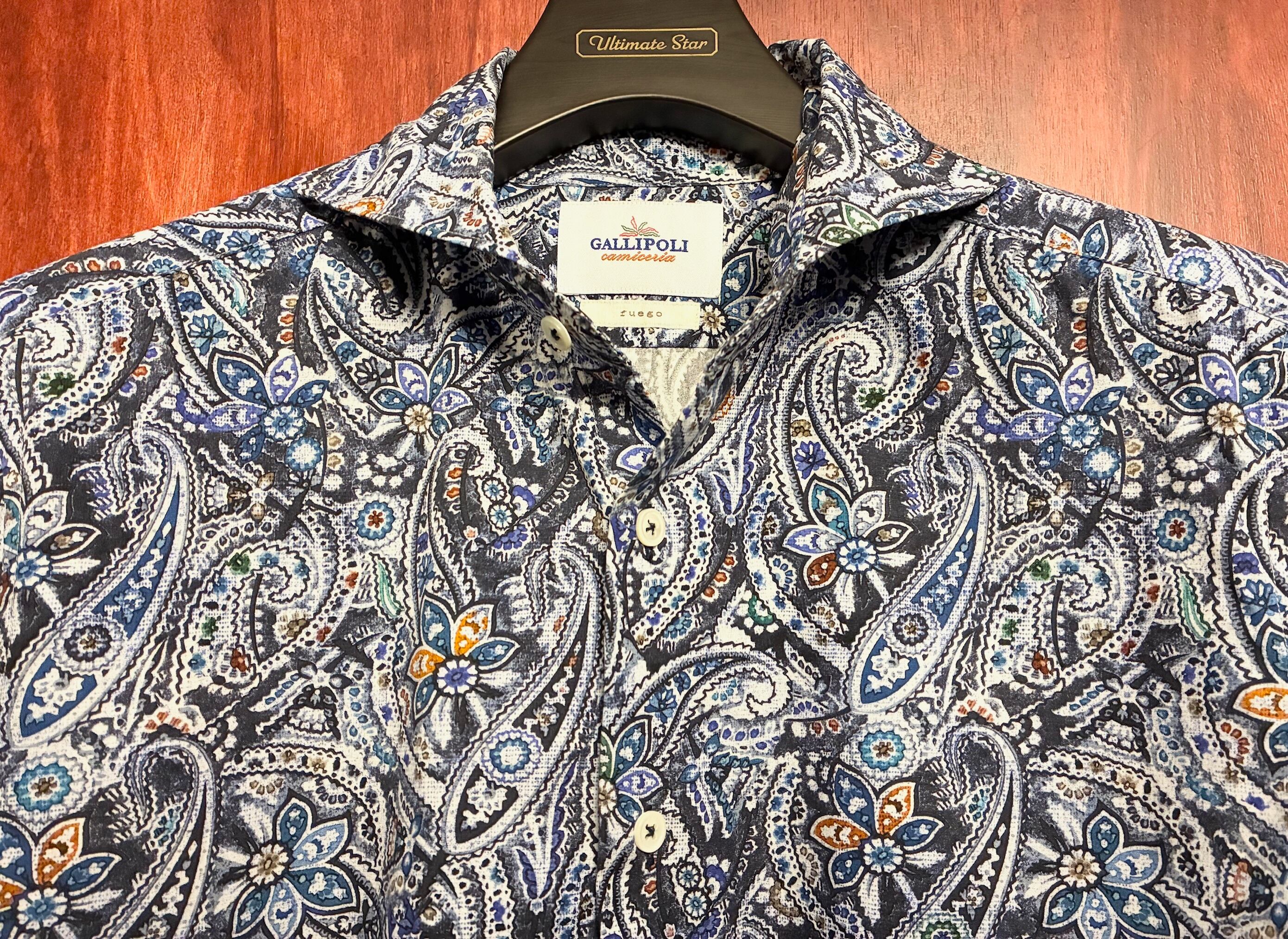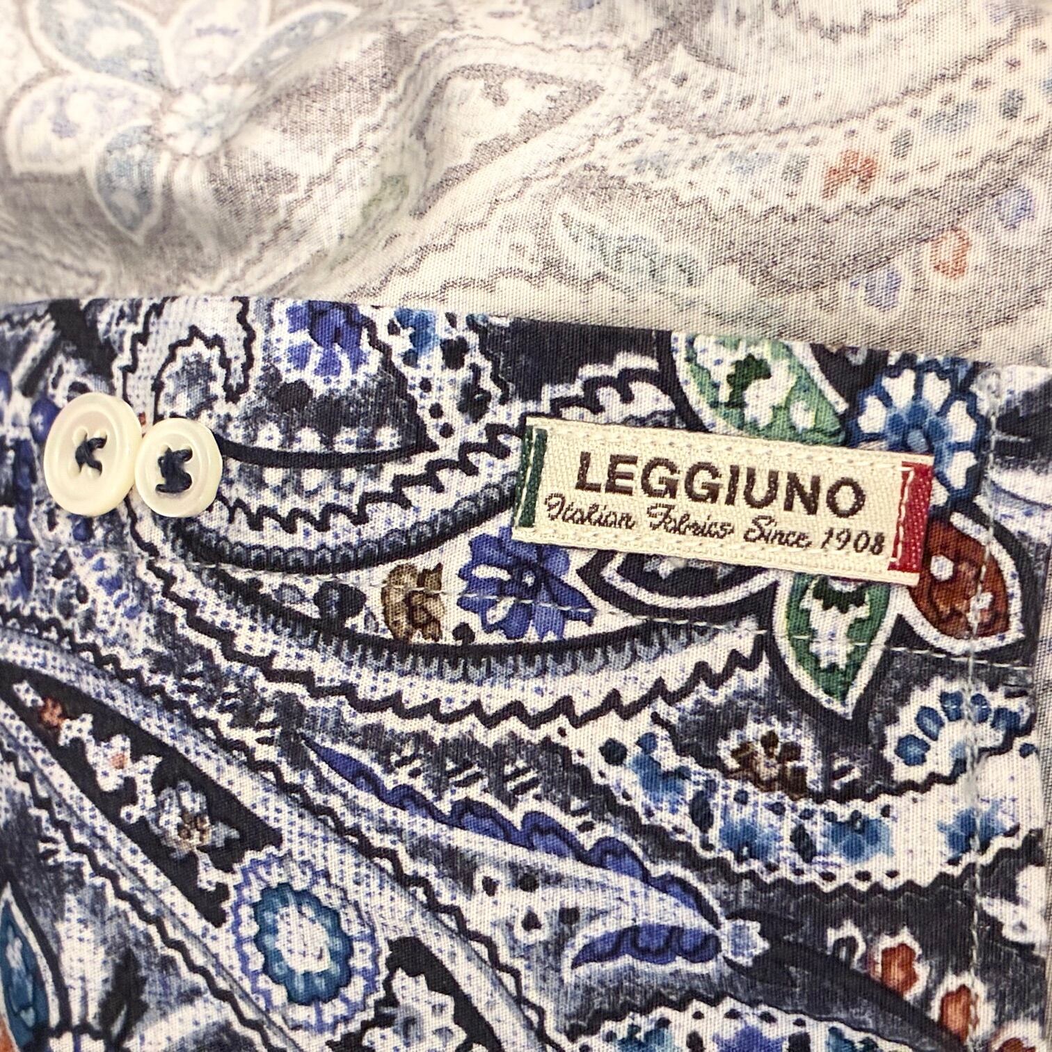 1908年にイタリア・マッジョーレ湖のほとりで創業した伝統あるシャツ生地メーカーのLEGGIUNO(レジウノ)のペイズリー総柄の上質な生地を使っており、派手なデザインながら落ち着いたカラーリングなので使い勝手が良く、ジャケット下のアクセントやノータイでも様になるイタリアシャツらしい色気溢れるオシャレなおすすめの一品です。