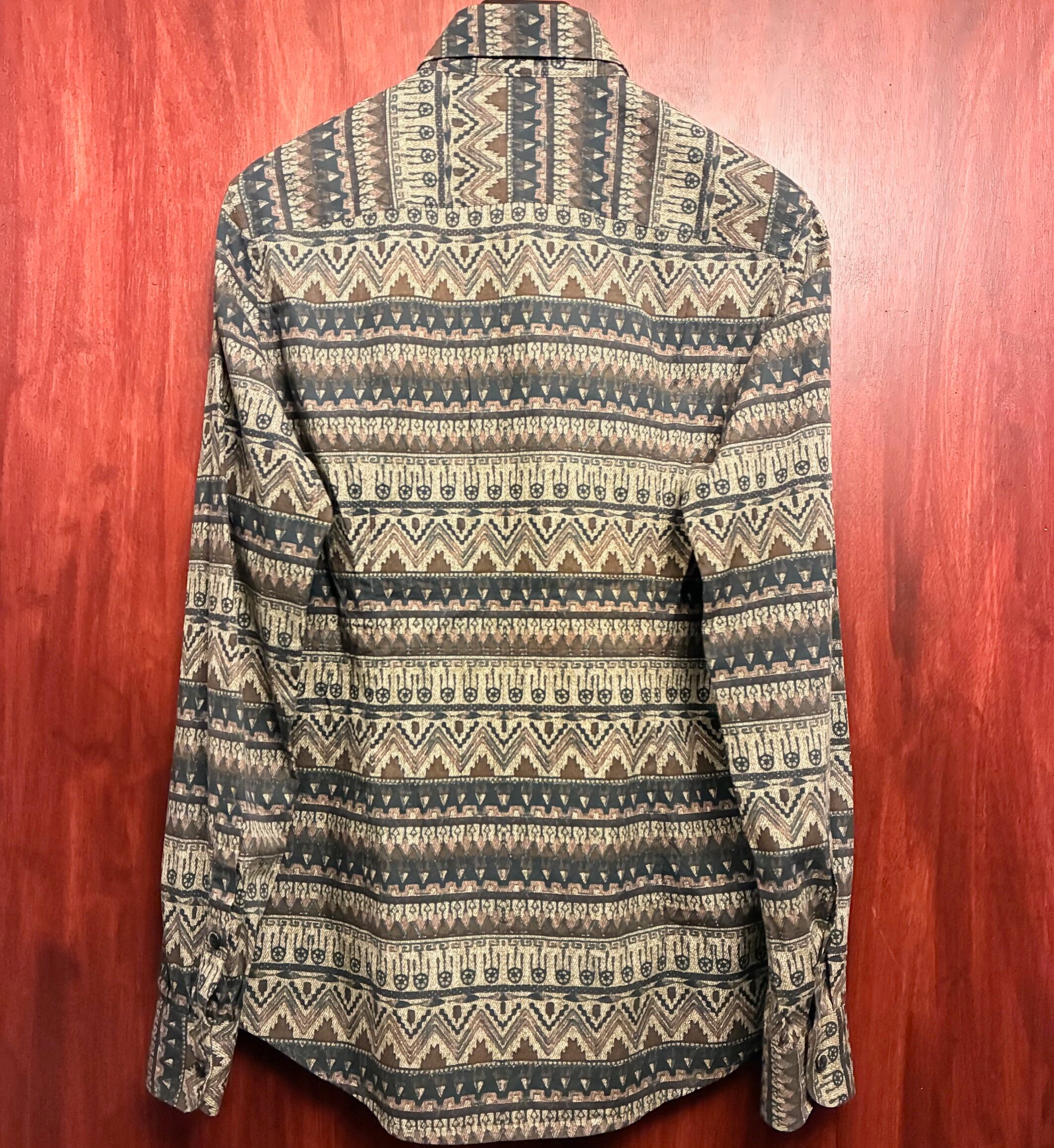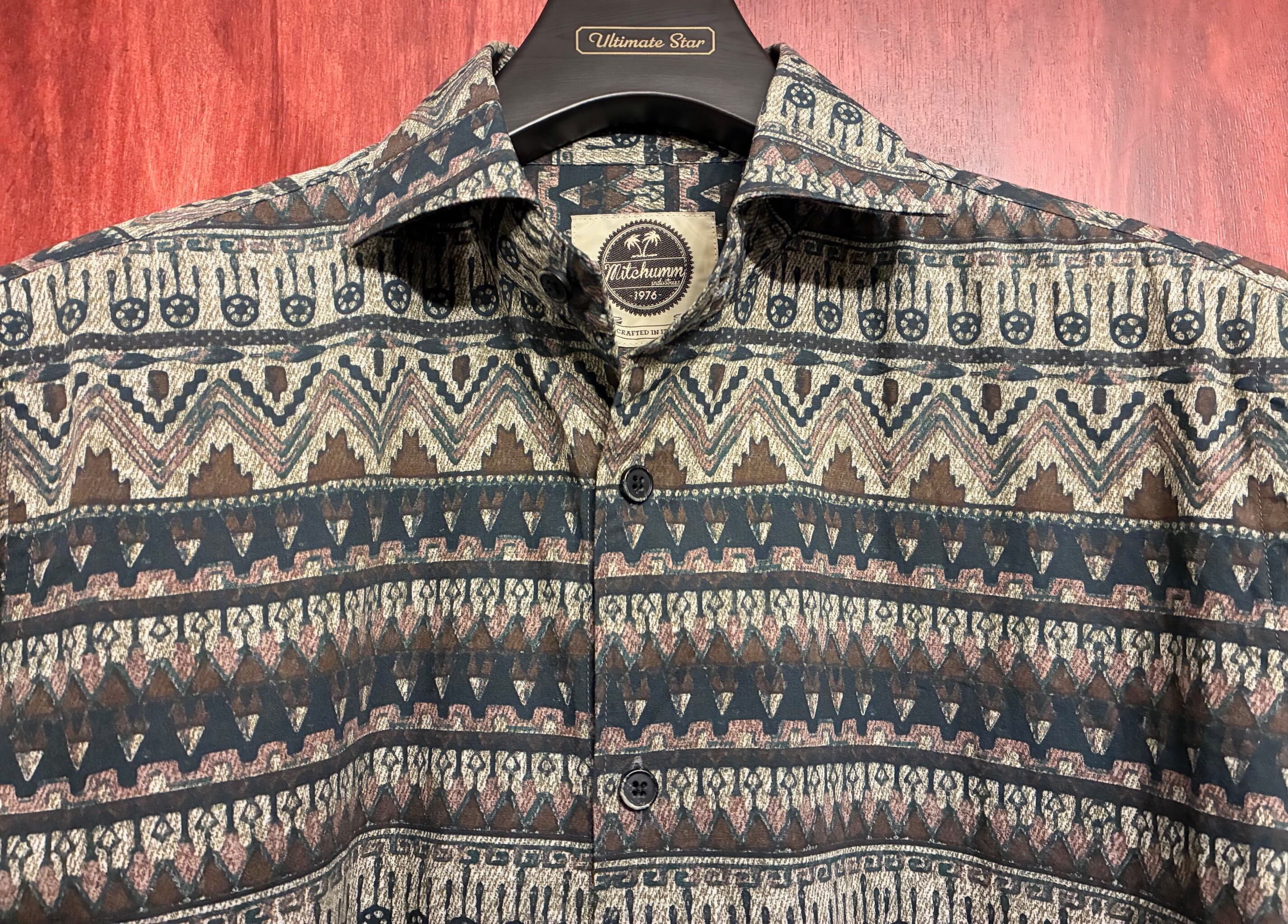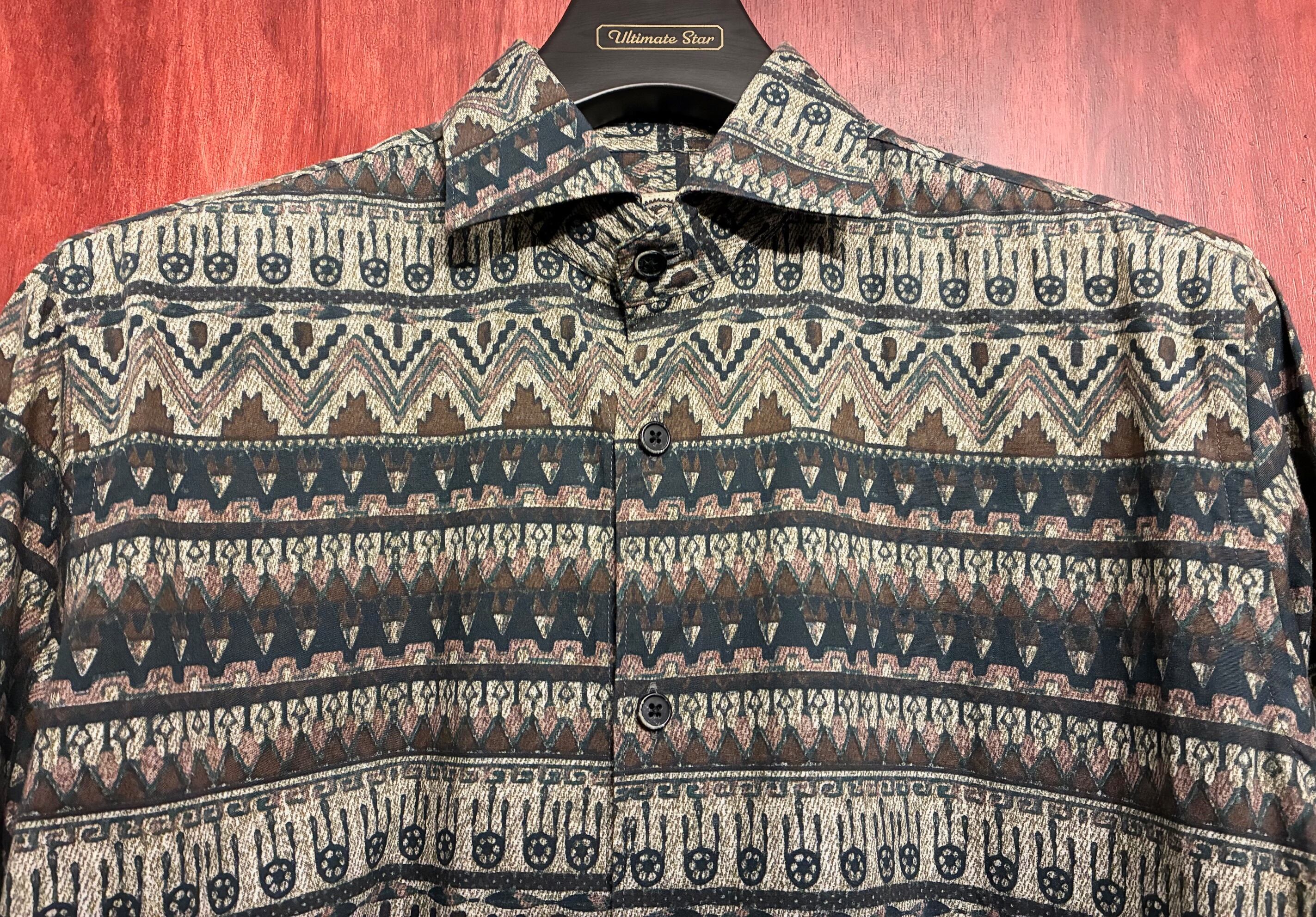ネイティブ柄のような独特な総柄デザインですが落ち着いたカラーリングなので使い勝手が良く、派手なデザインなのでジャケット下のアクセントやノータイでも様になるイタリアシャツらしい色気溢れるオシャレなおすすめの一品です。