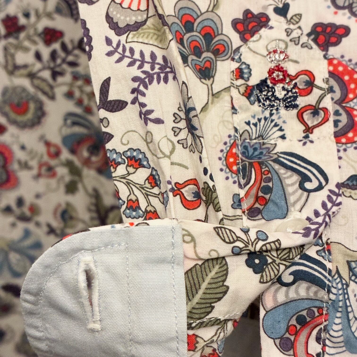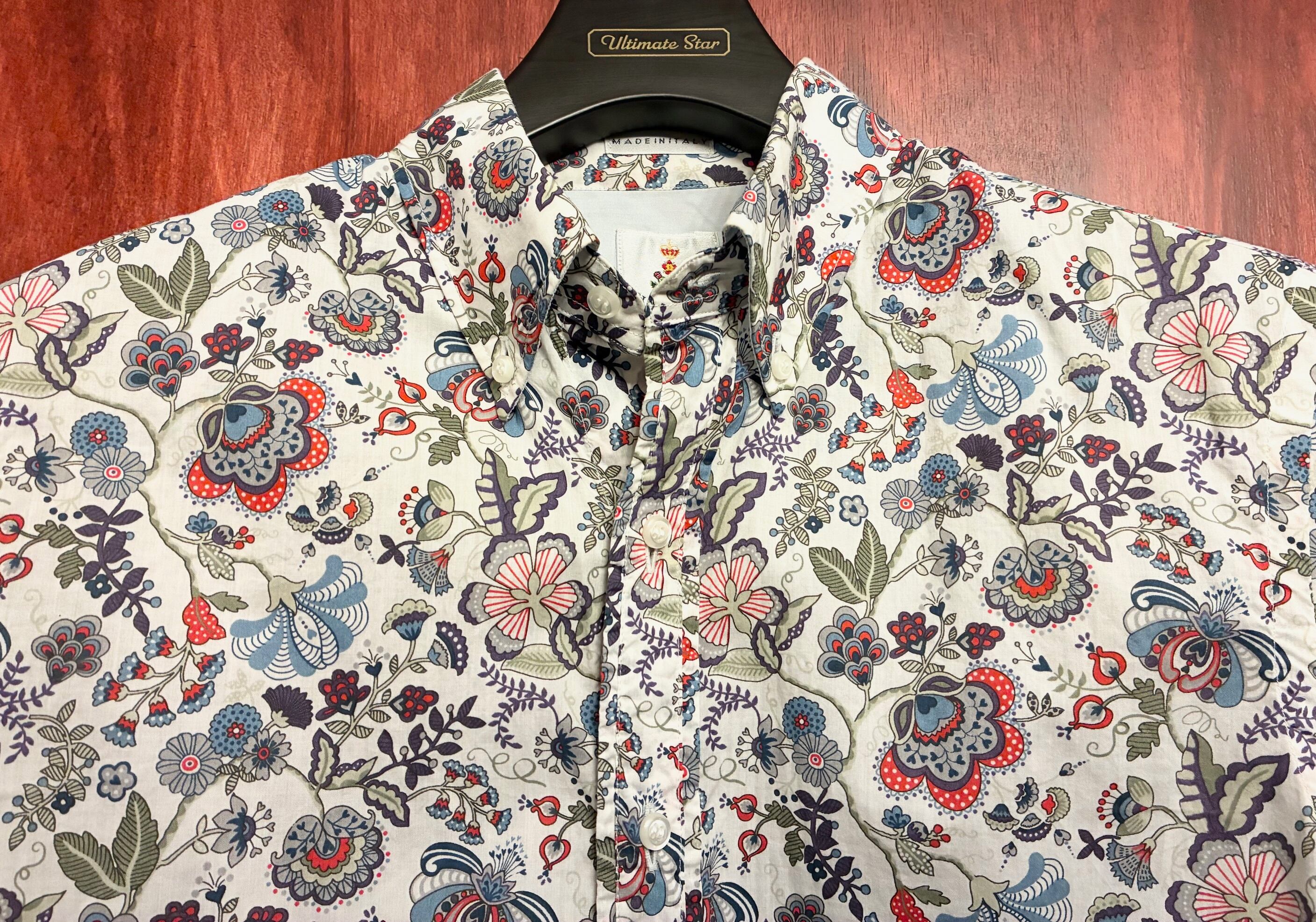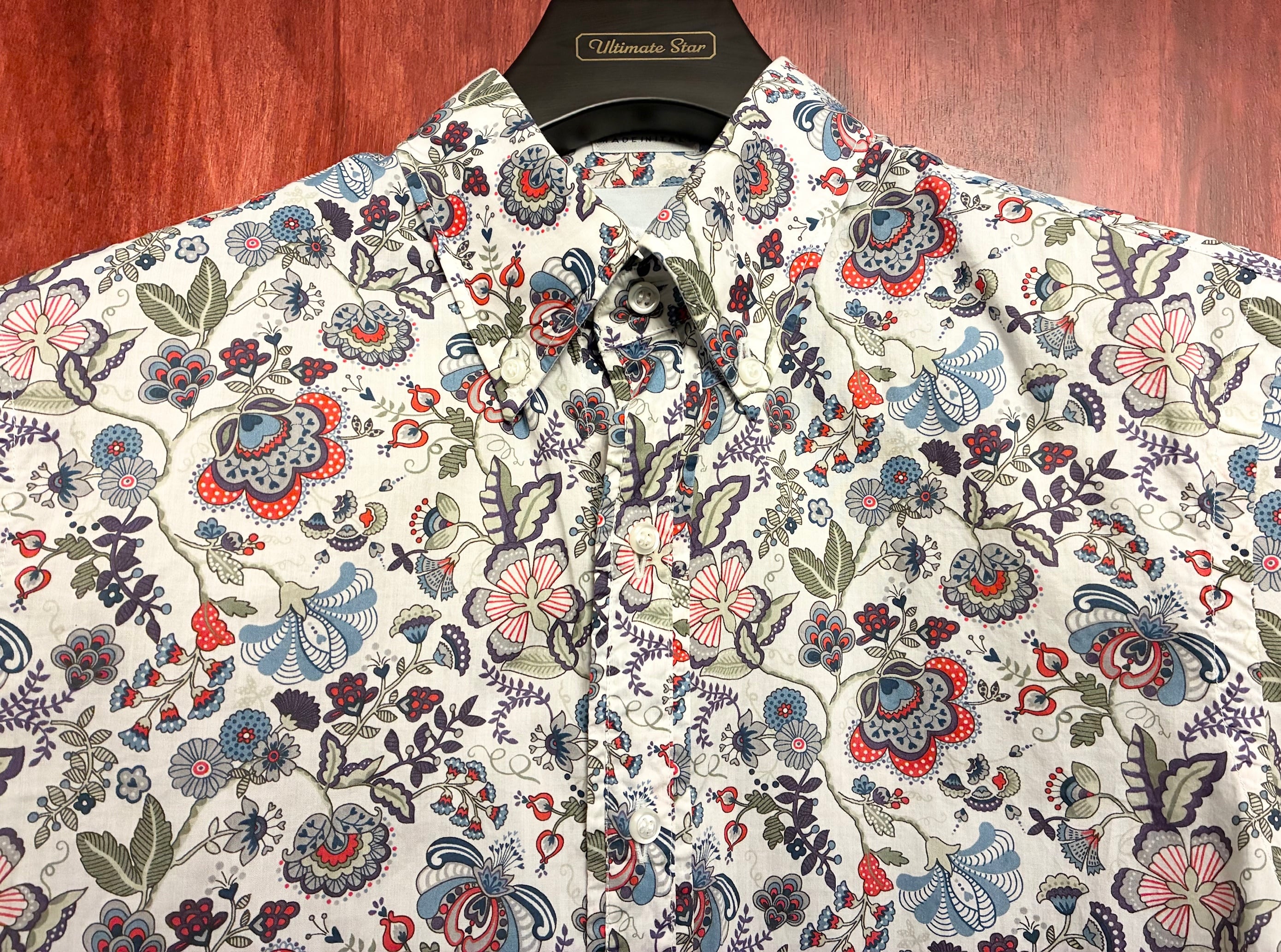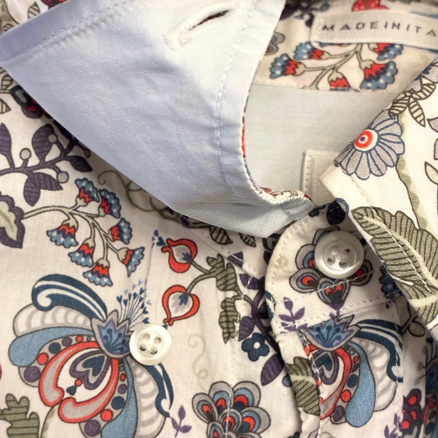 シルクやレーヨンのような滑らかな肌さわりのホワイトの生地に総柄のペイズリー柄をほどこした派手なデザインなのでジャケット下のアクセントやノータイでも様になるイタリアシャツらしい色気溢れるオシャレなおすすめの一品です。