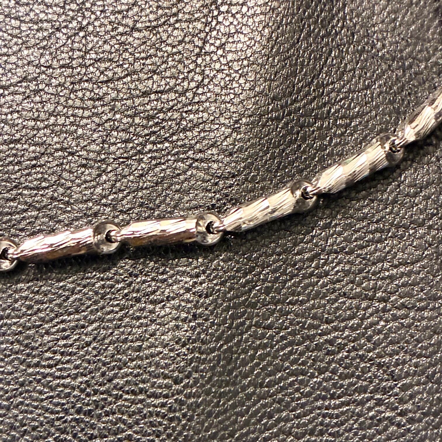 光が反射するようなカットデザインと無地のシンプルなデザインを組み合わせており、別売りのネックレスと組み合わせるとロングチェーンとして使うことも可能です。