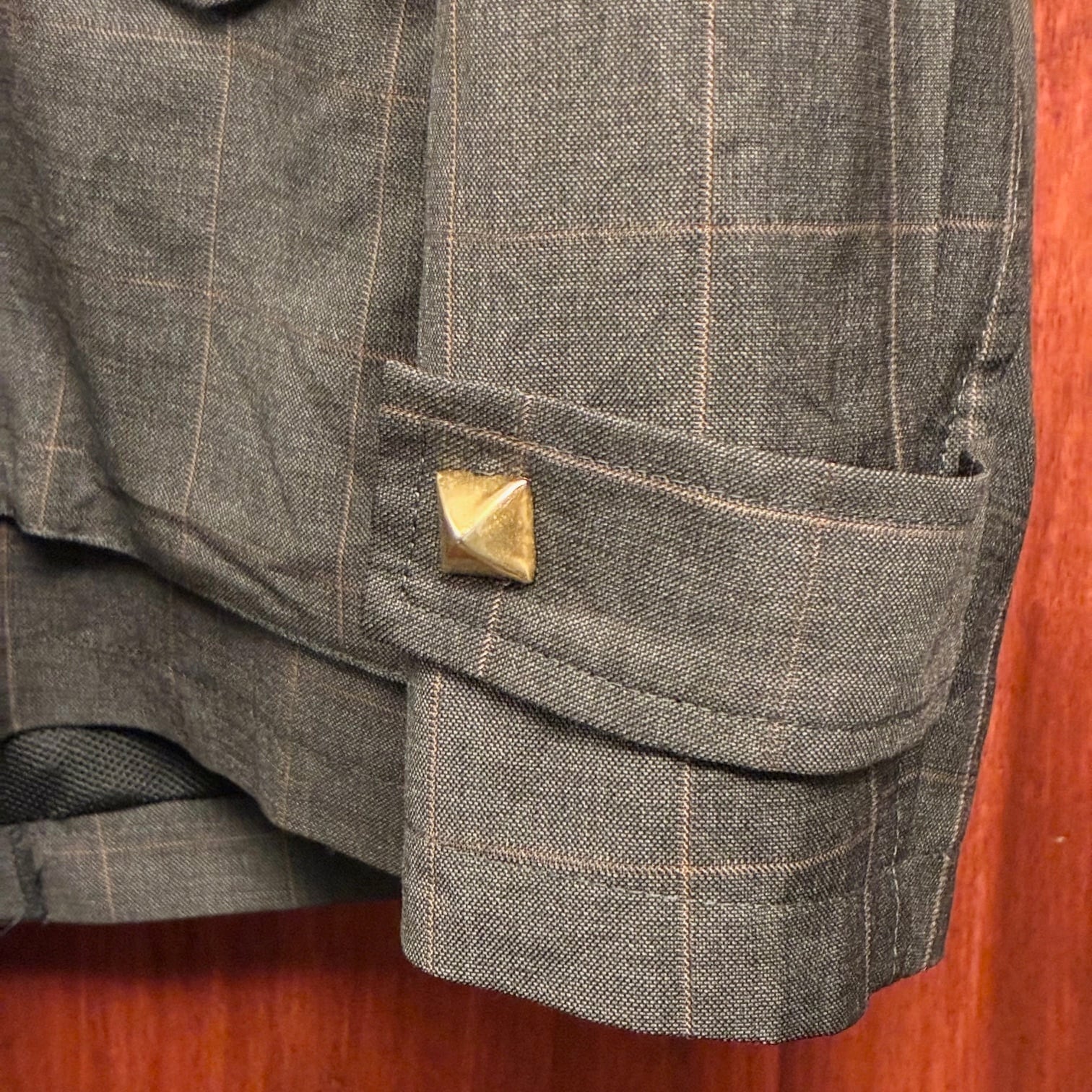 テーラードジャケットなどで使われるようなチェック柄のウール素材を使っており、肩章と呼ばれるエポーレット部分や袖口にゴールドのスタッズがアクセントになっております。