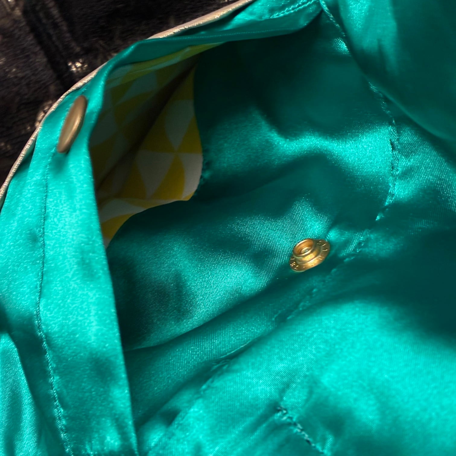 チャイナジャケットやカンフージャケットと呼ばれるデザインをベースに、パープルのサテン地にフェノメノンの人気デザインのタイガーカモと呼ばれる虎の模様をベースにした迷彩柄をレースで表現した高級感溢れるデザインを前身頃と両袖に使っております。