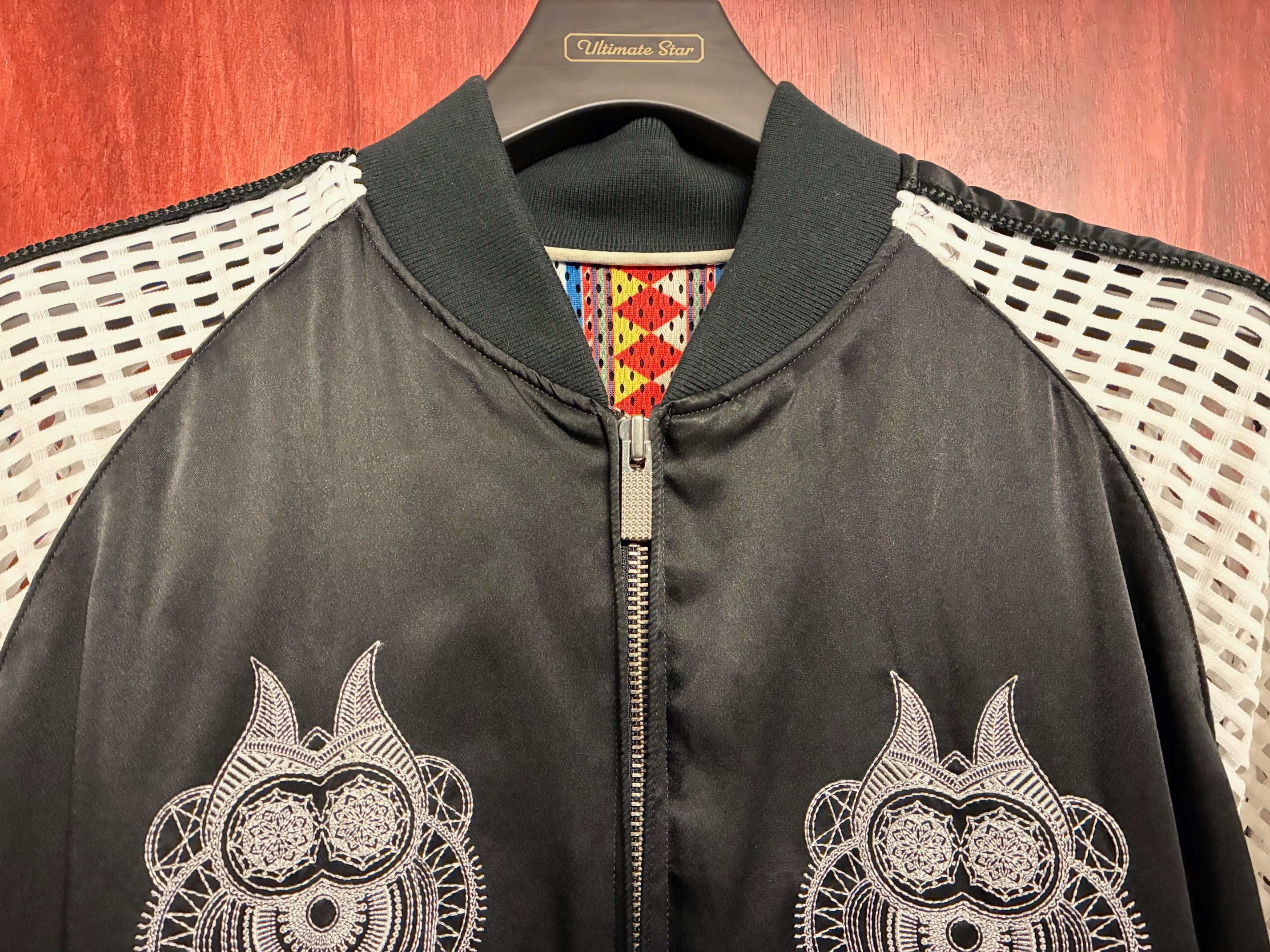 光沢感のあるサテン地にスカジャンの特徴である両胸と背中に非常に細かくきれいな刺繍を施しており、両袖が装飾パイピングとメッシュのようなデザインになった高級感溢れるデザインとなっております。
