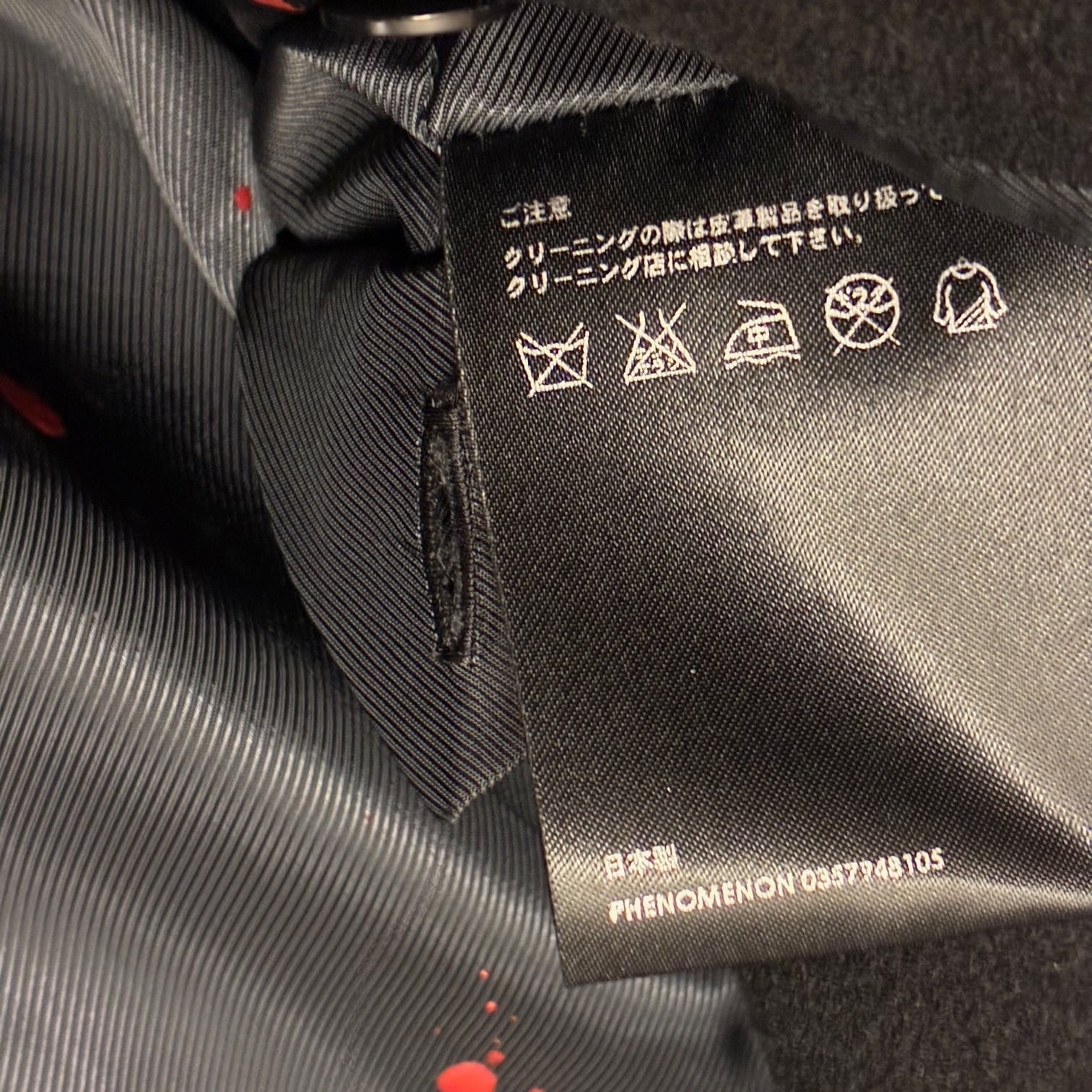裏地はこのシーズンで使われた血のようなデザインがほどこされており、ブランドタグもコレクション期から使われた黒のタグを仕様しております。