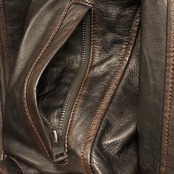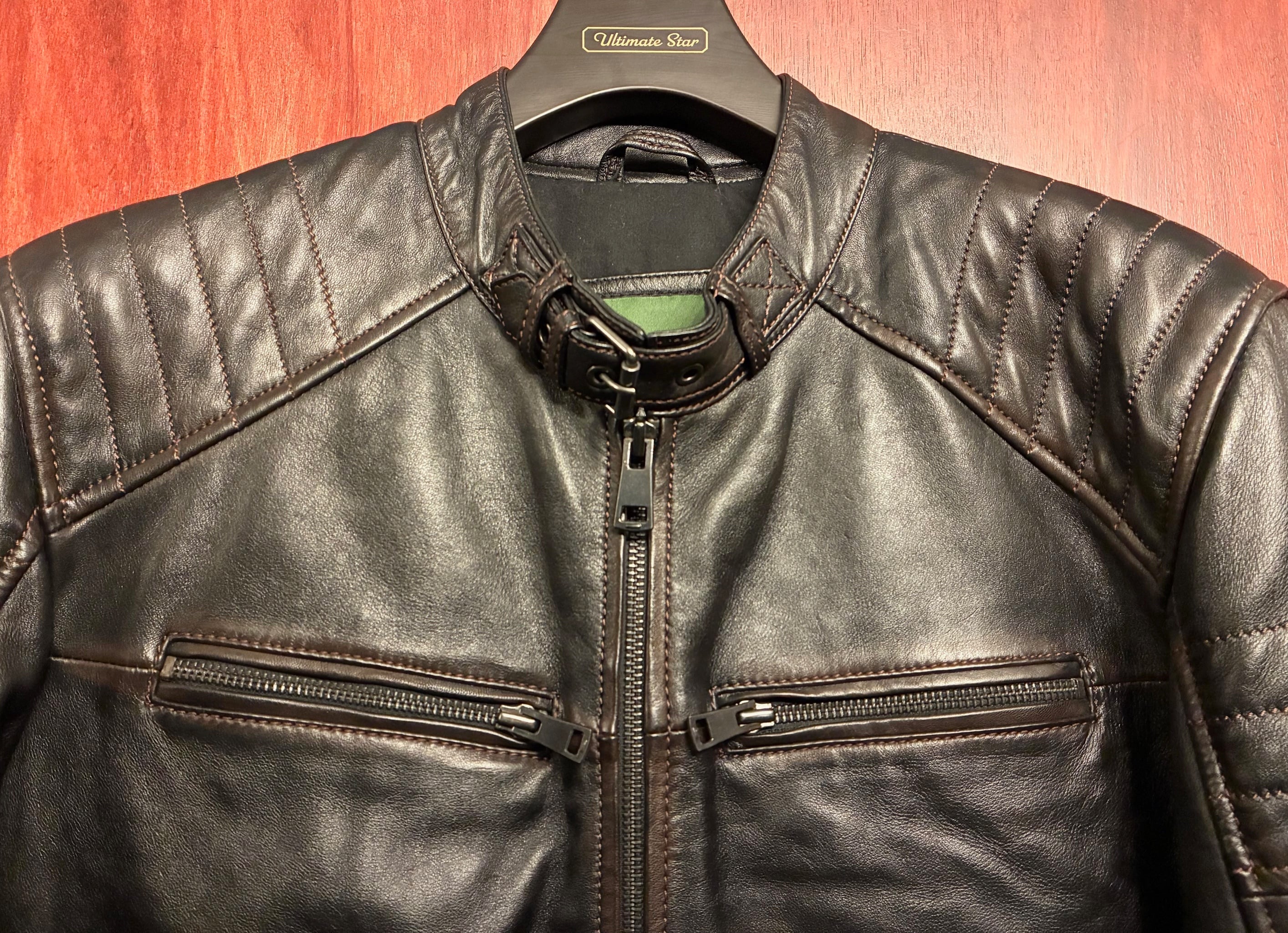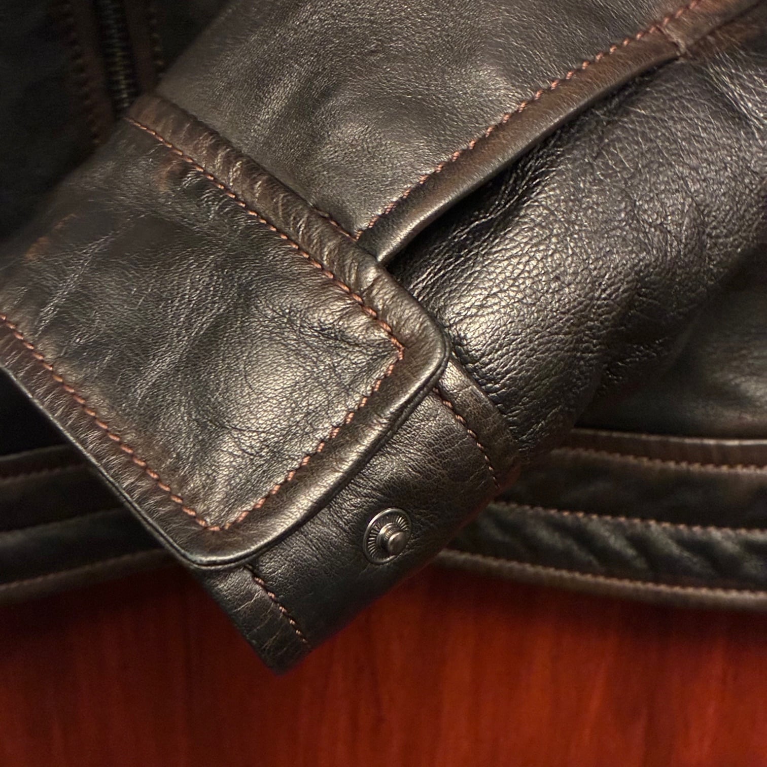 濃いめのこげ茶のようなカラーリングのレザーを使っており、バイカージャケットのようなショルダーデザインがオシャレなおすすめの一品です。