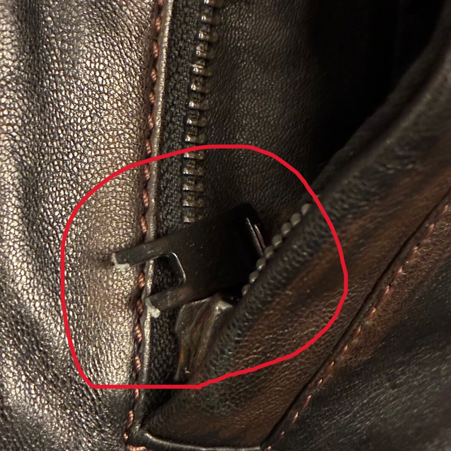 着用上は問題ありませんが、右サイドポケットのジッパーが破損しており、内ポケットのボタン部分のレザー紐が切れている為、特価での販売となります。