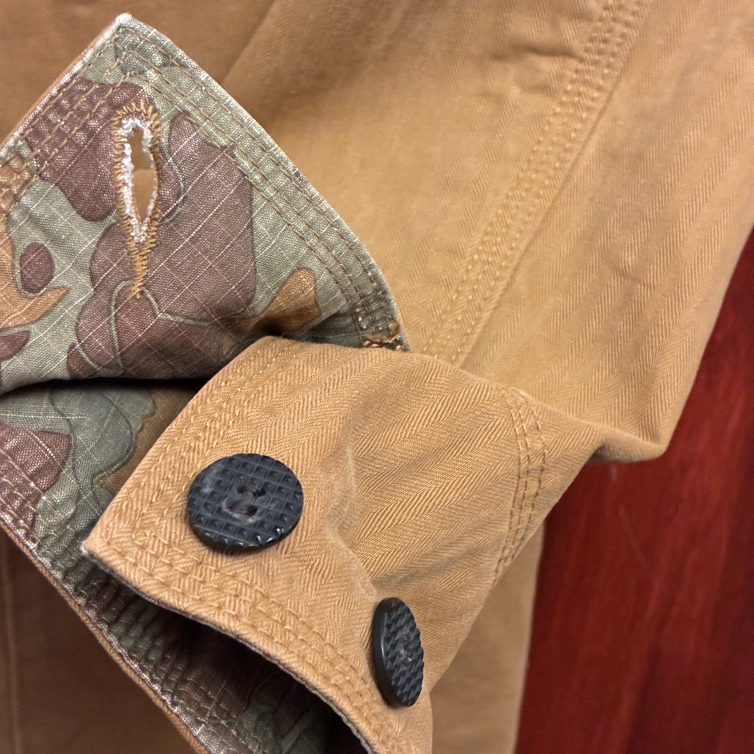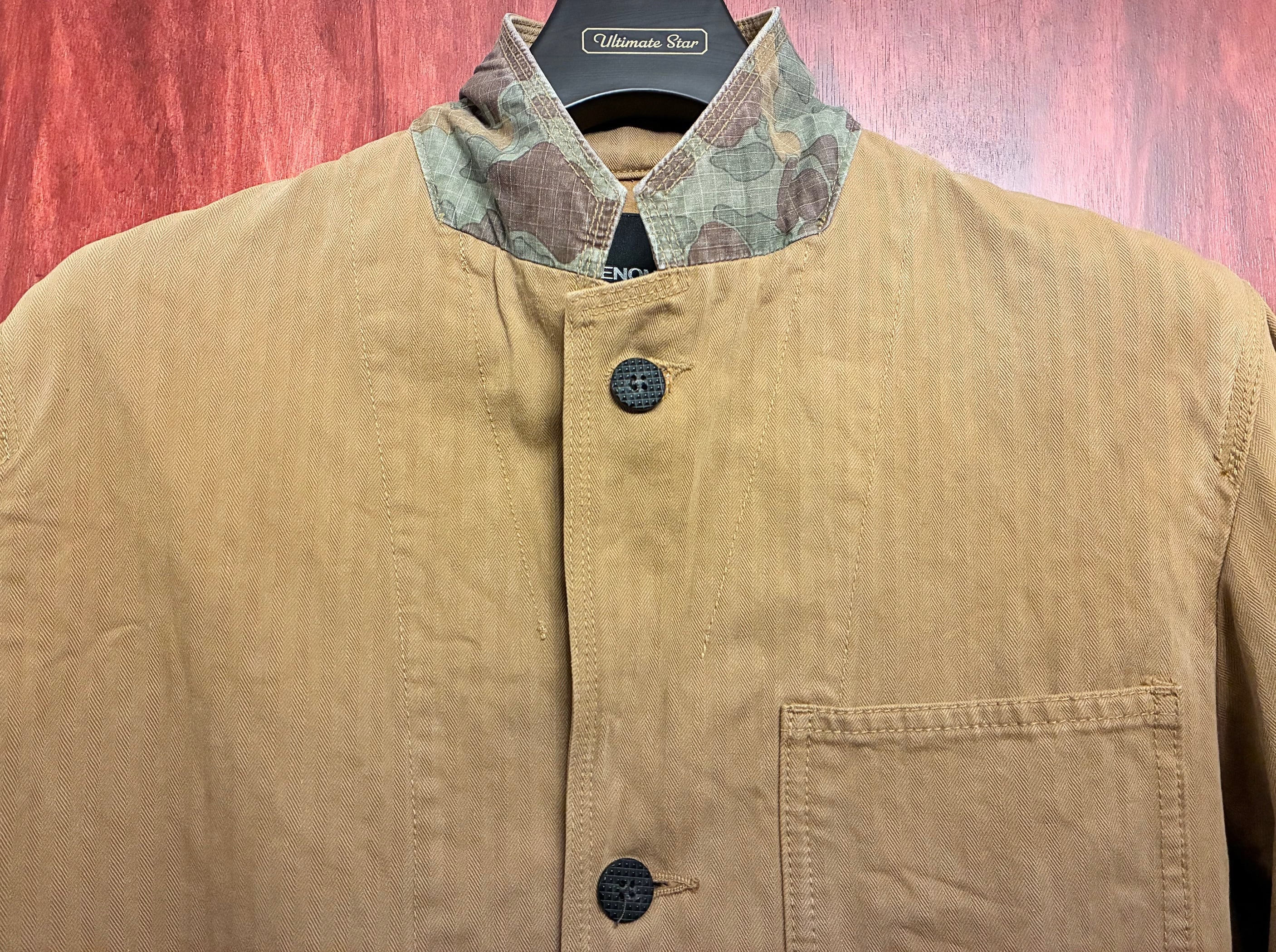 スタッズをイメージしたボタンを使っており、本切羽の袖裏や襟裏に迷彩柄を使ったフェノメノンらしい遊び心溢れるオシャレなおすすめの一品です。