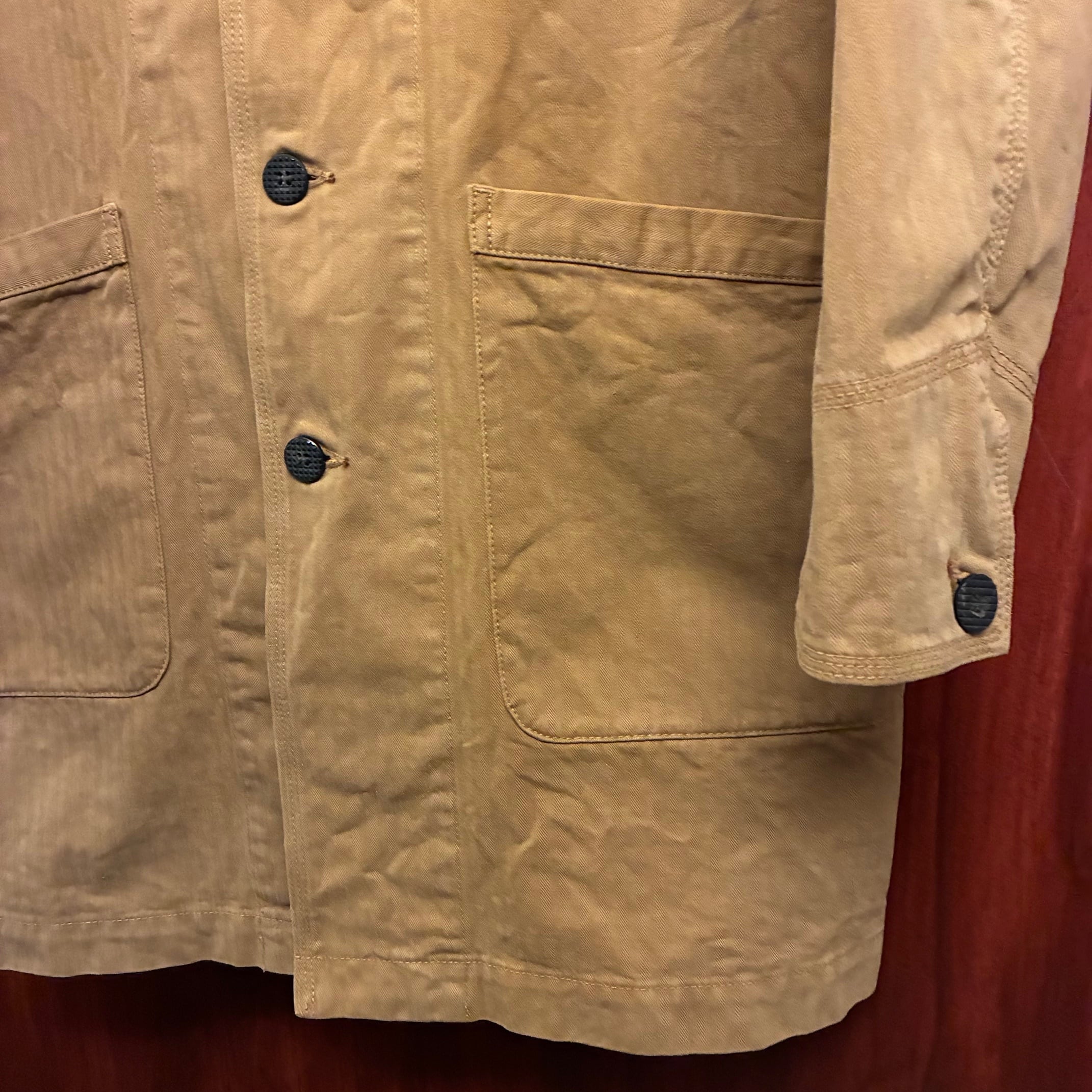 シャドーヘリンボーン柄のワーキングウェアのようなコットン生地を使っており、襟を立ててボタンを留めるとスタンドカラーコートのようなデザインになるので、2WAYの着こなしが可能です。