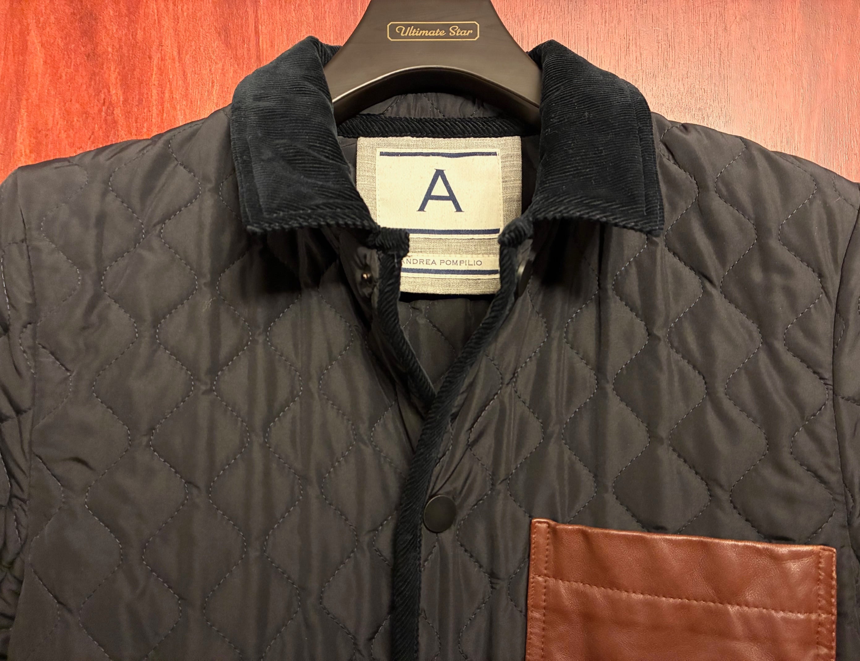 MADE IN ITALY製 ANDREA POMPILIO レザーコンビ 中綿キルティングジャケット ブラック×ブラウン 46サイズ