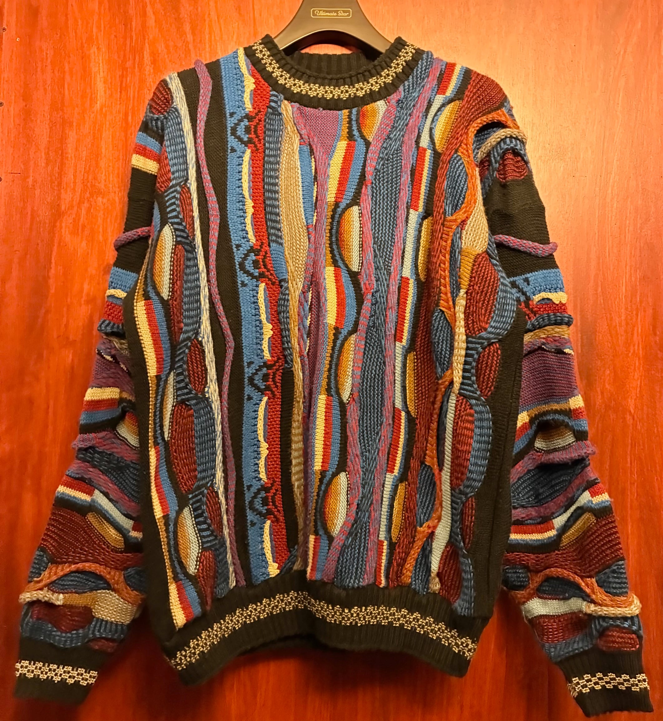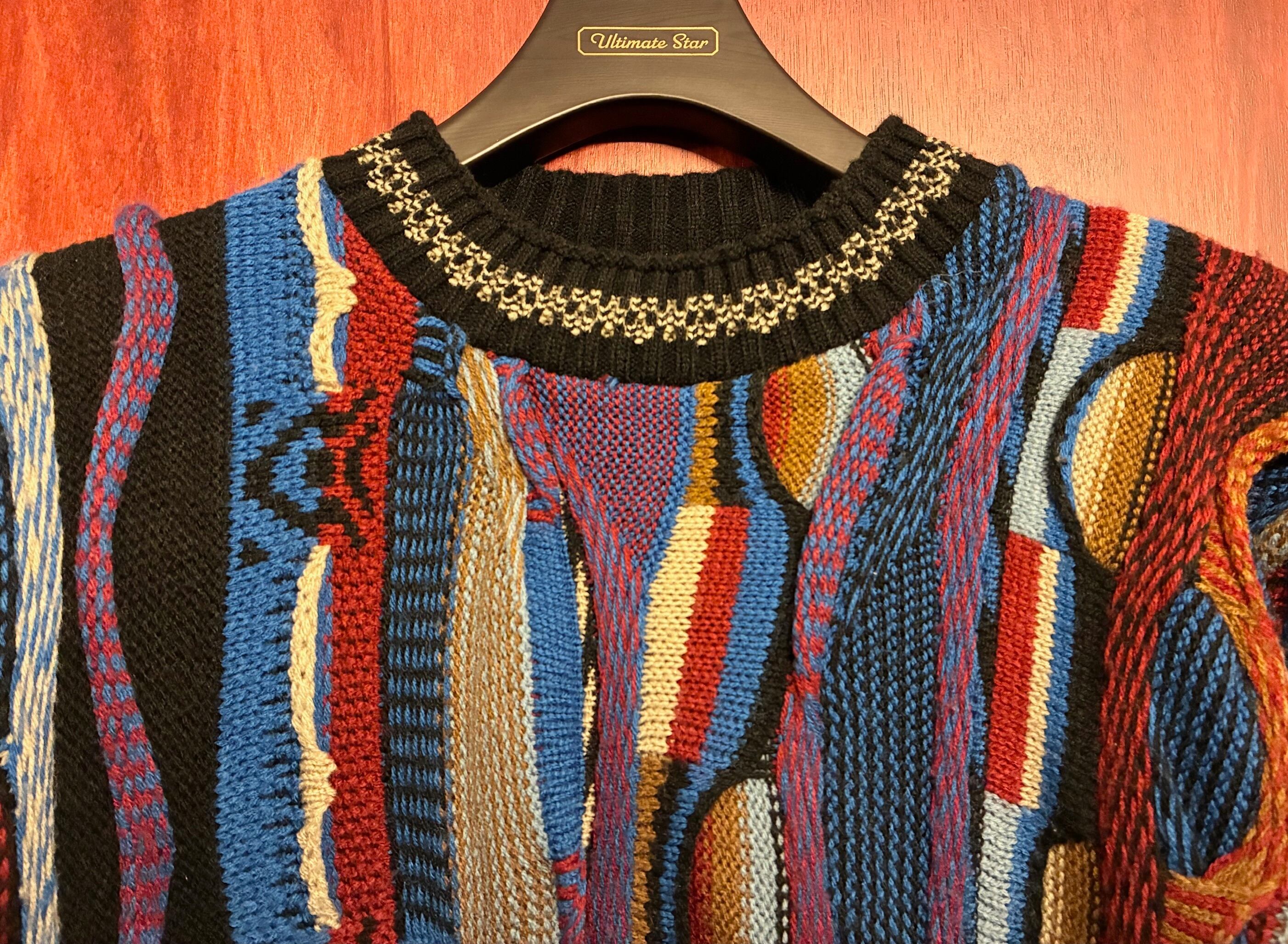 3Dニットセーターと呼ばれる立体編みのセーターは、COOGI(クージー)を筆頭に古着の中でも非常に人気のあるデザインで、クージーの特徴でもある大胆でカラフルなデザインと立体構造の織り、オーバーサイズなシルエットなど特徴的なパターンから「COOGI柄」とも呼ばれております。