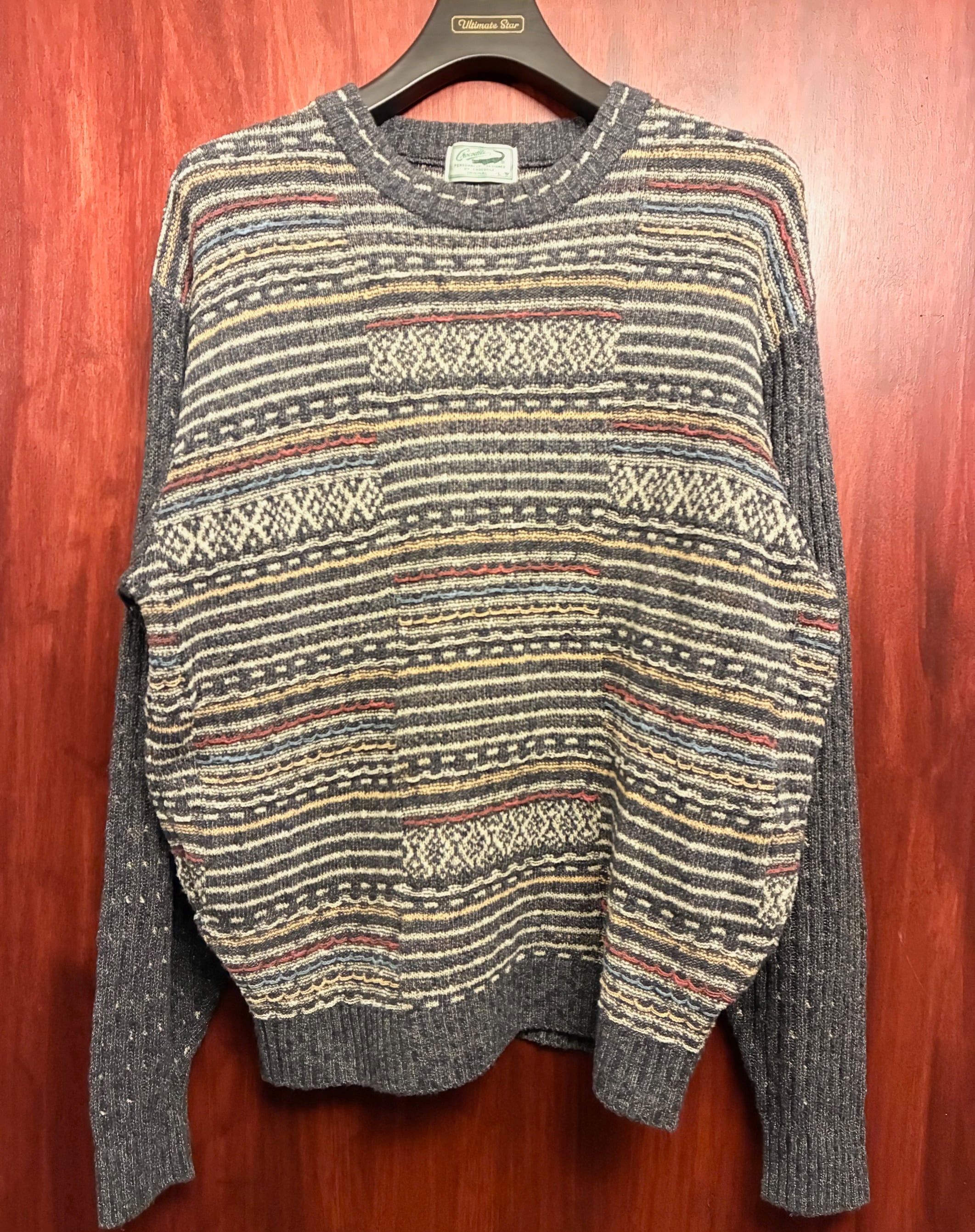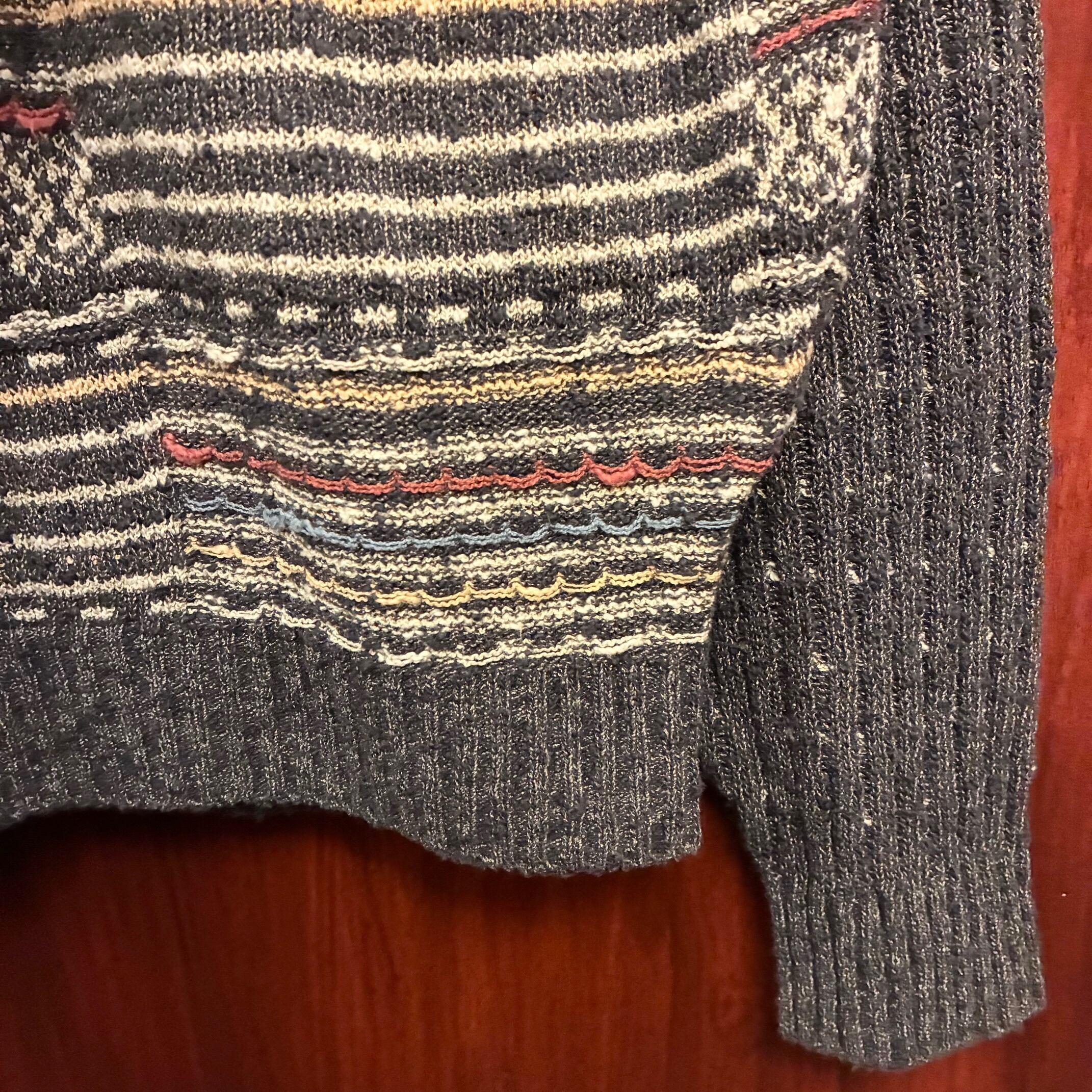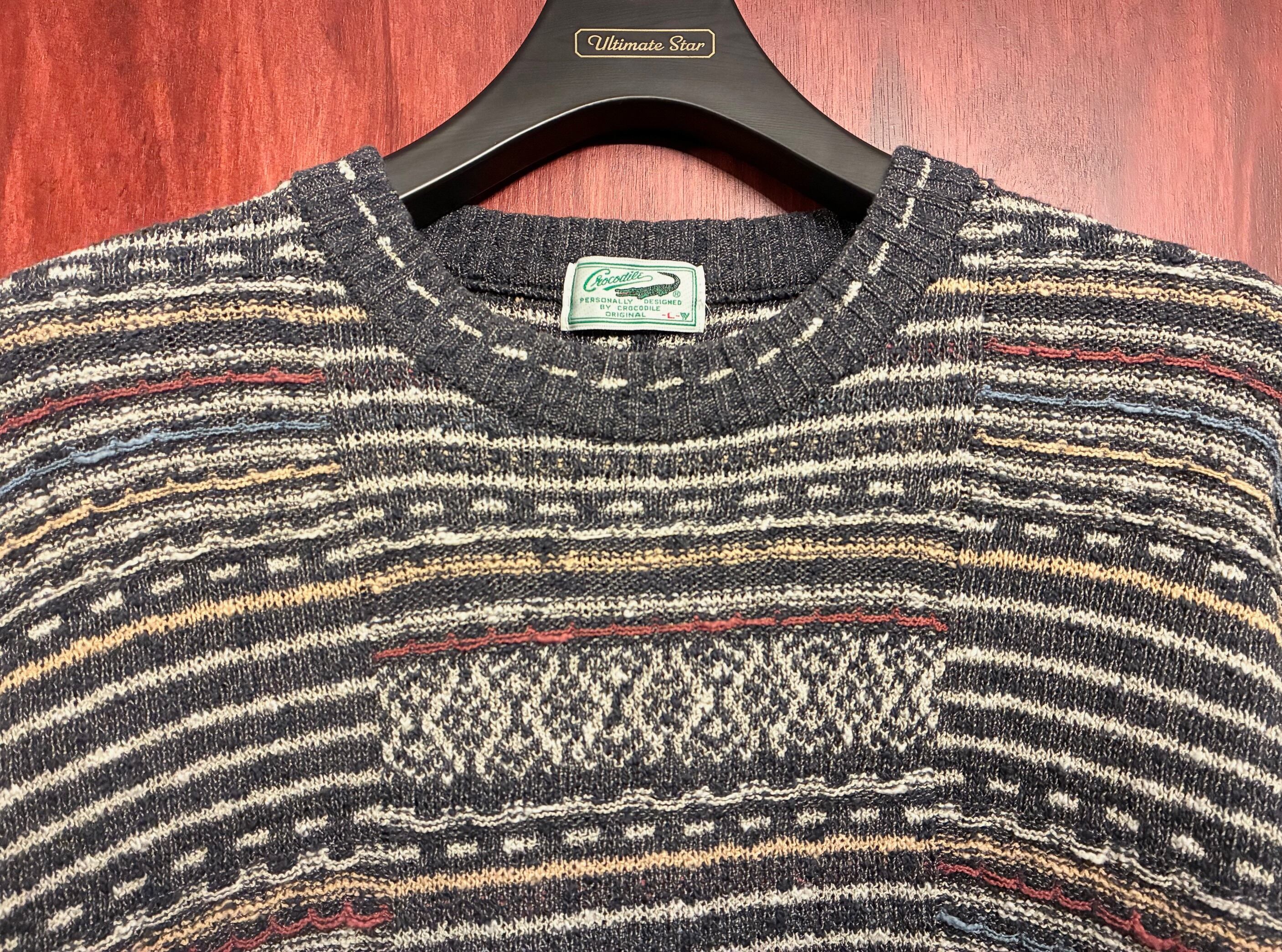 MADE IN JAPAN製 Crocodile ボーダー柄 3Dニット クルーネックコットンアクリルセーター グレー×マルチカラー Lサイズ
