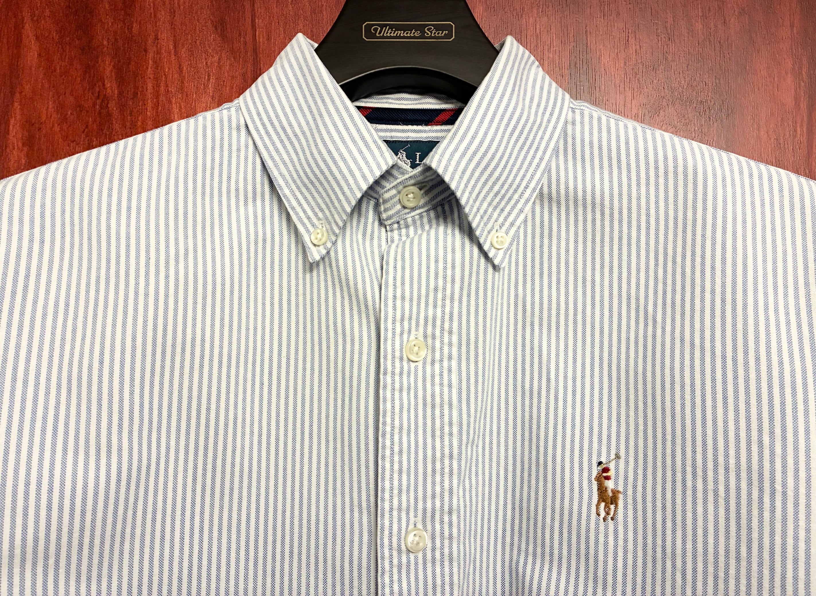Ralph Lauren CLASSIC FIT ヒッコリーストライプ柄 長袖ボタンダウンオックスフォードシャツ サックスブルー×ホワイト Sサイズ