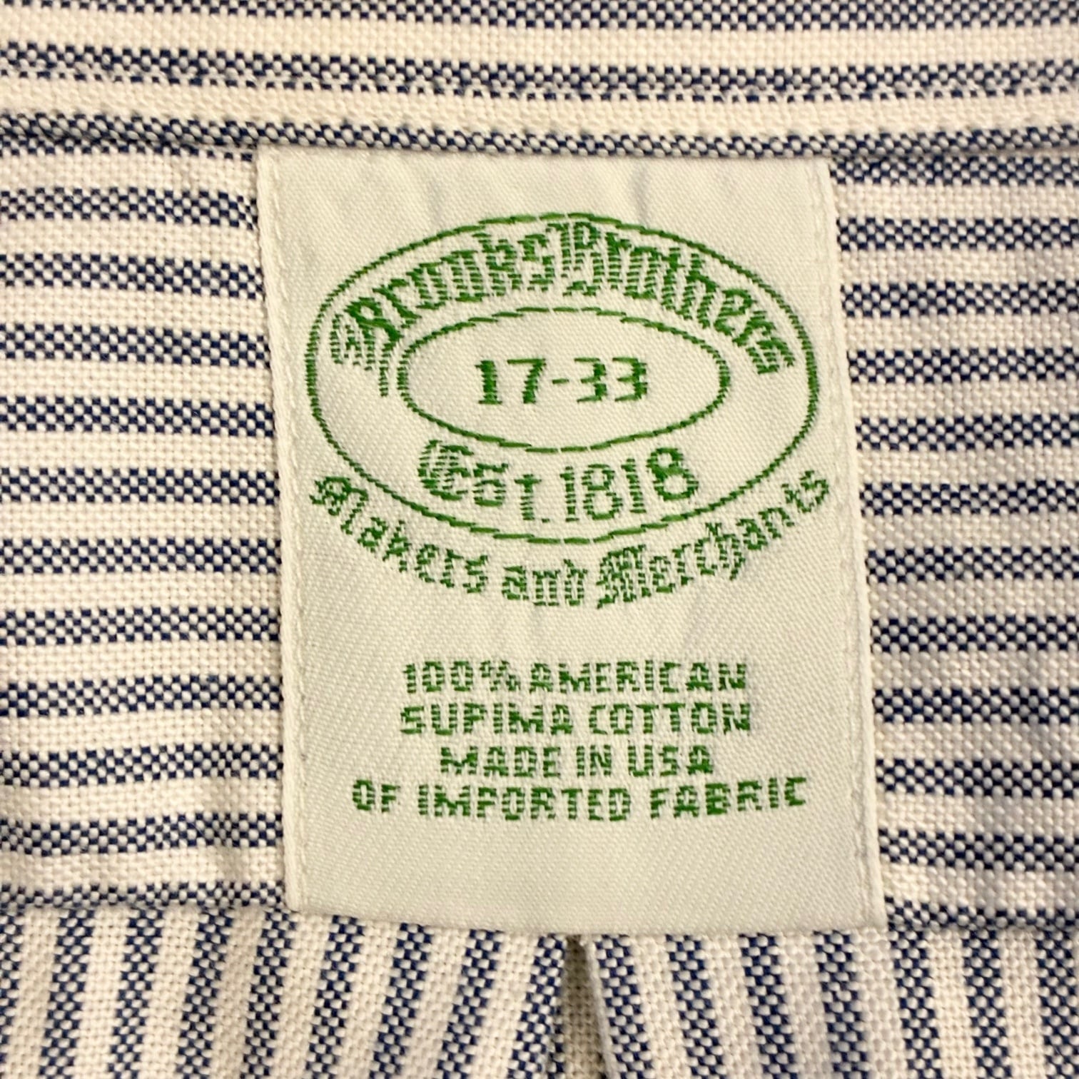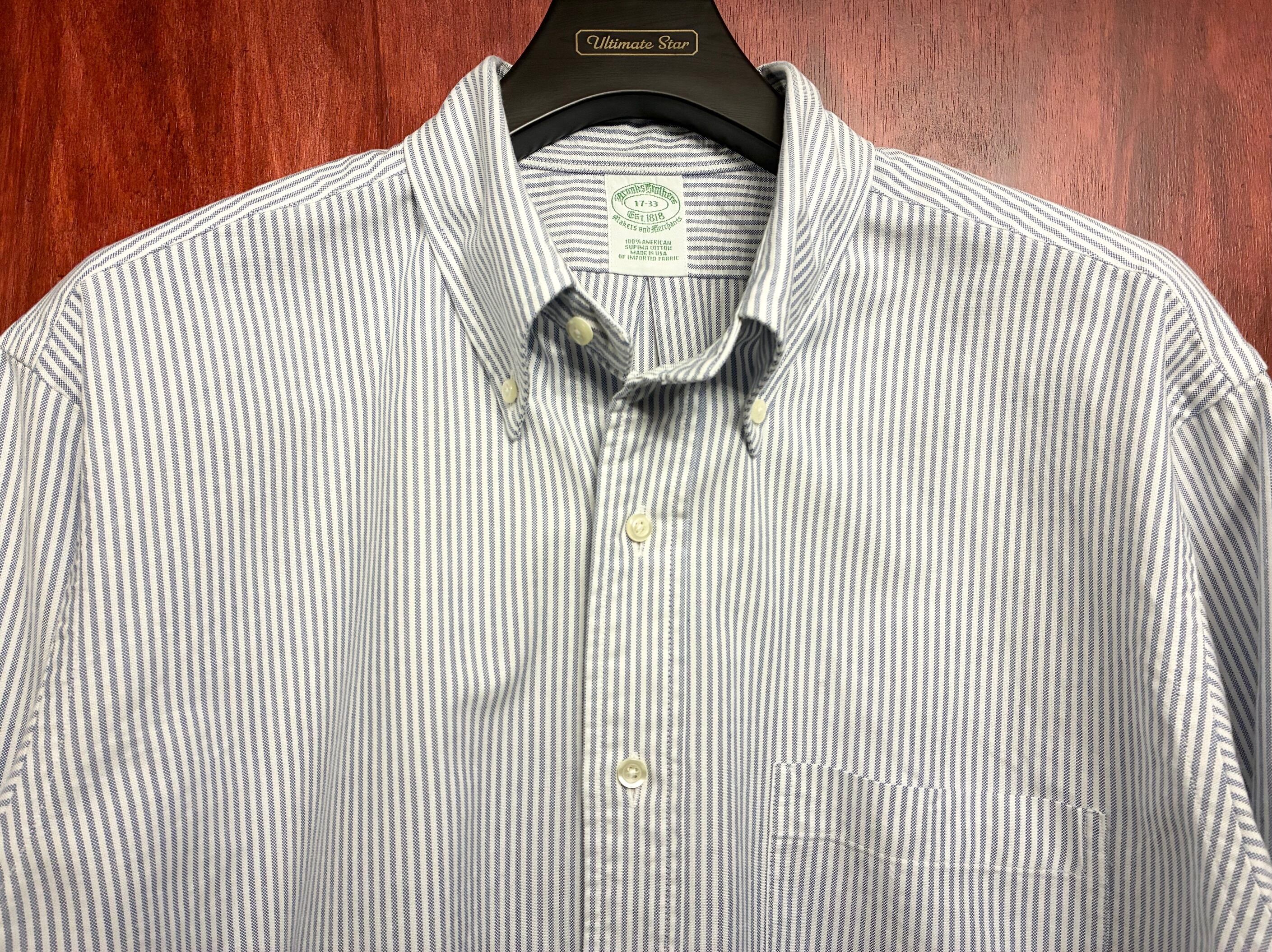 MADE IN USA製 BROOKS BROTHERS アメリカンスーピマコットン ヒッコリーストライプ柄 長袖ボタンダウンオックスフォードシャツ サックスブルー×ホワイト 17-33サイズ