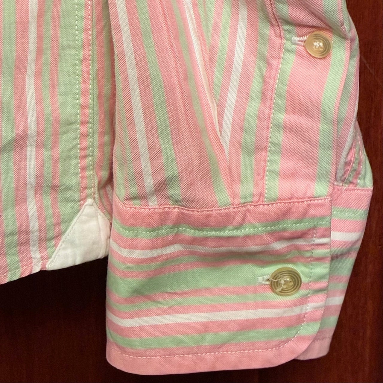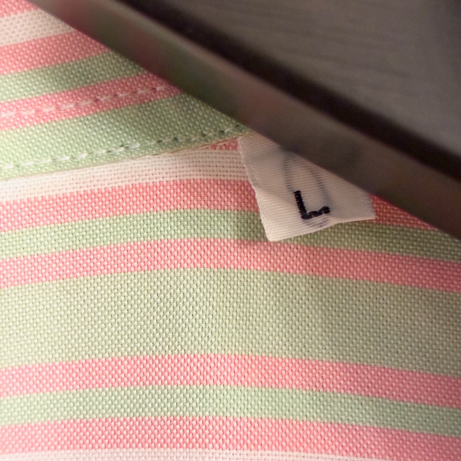 ピンクのオックスフォード生地にライトグリーンとホワイトのストライプ柄が入ったカラフルなカラーリングで、ガゼットやカフス裏にホワイトの生地を使ったコーディネートのアクセントに活躍するオシャレなおすすめの一品です。