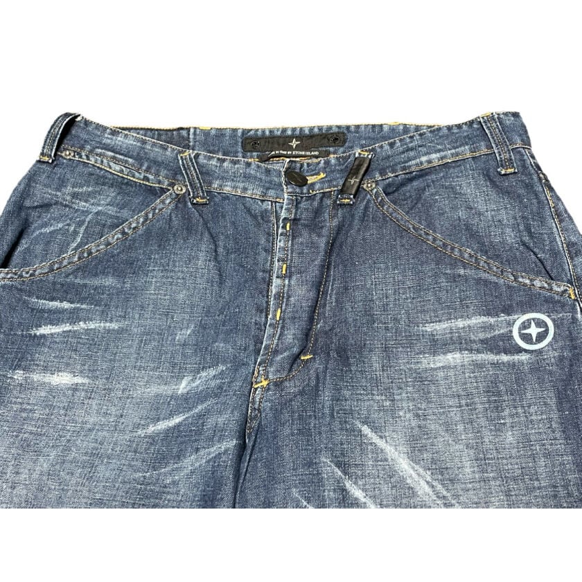 前左ポケット下とベルトループにストーンアイランドのロゴが入っており、色落ちやダメージ加工をほどこしたおしゃれな一品です。