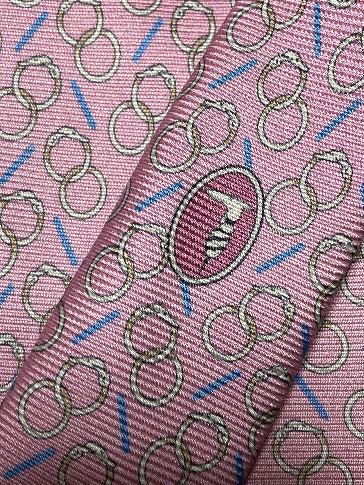上質なシルクを使っており、発色のきれいな知恵の輪のようなデザインが全面にプリントされたデザインに、小剣にトラサルディのロゴが入った細部までこだわったおすすめの一品です。