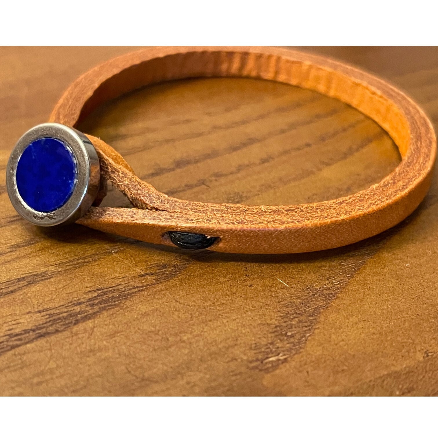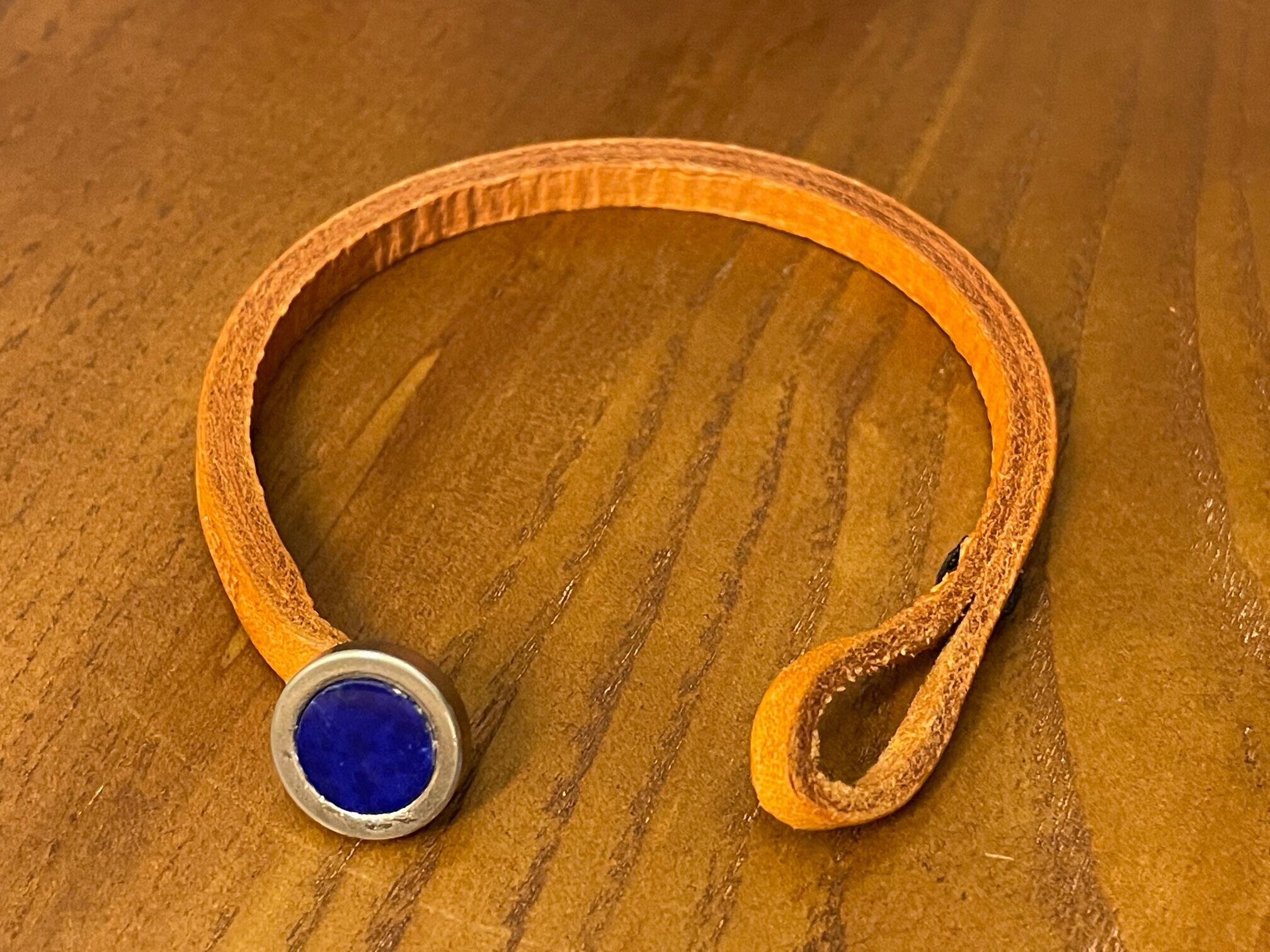 こちらはラピスラズリというパワーストーンを使ったハンドメイドのレザーブレスレットです。
