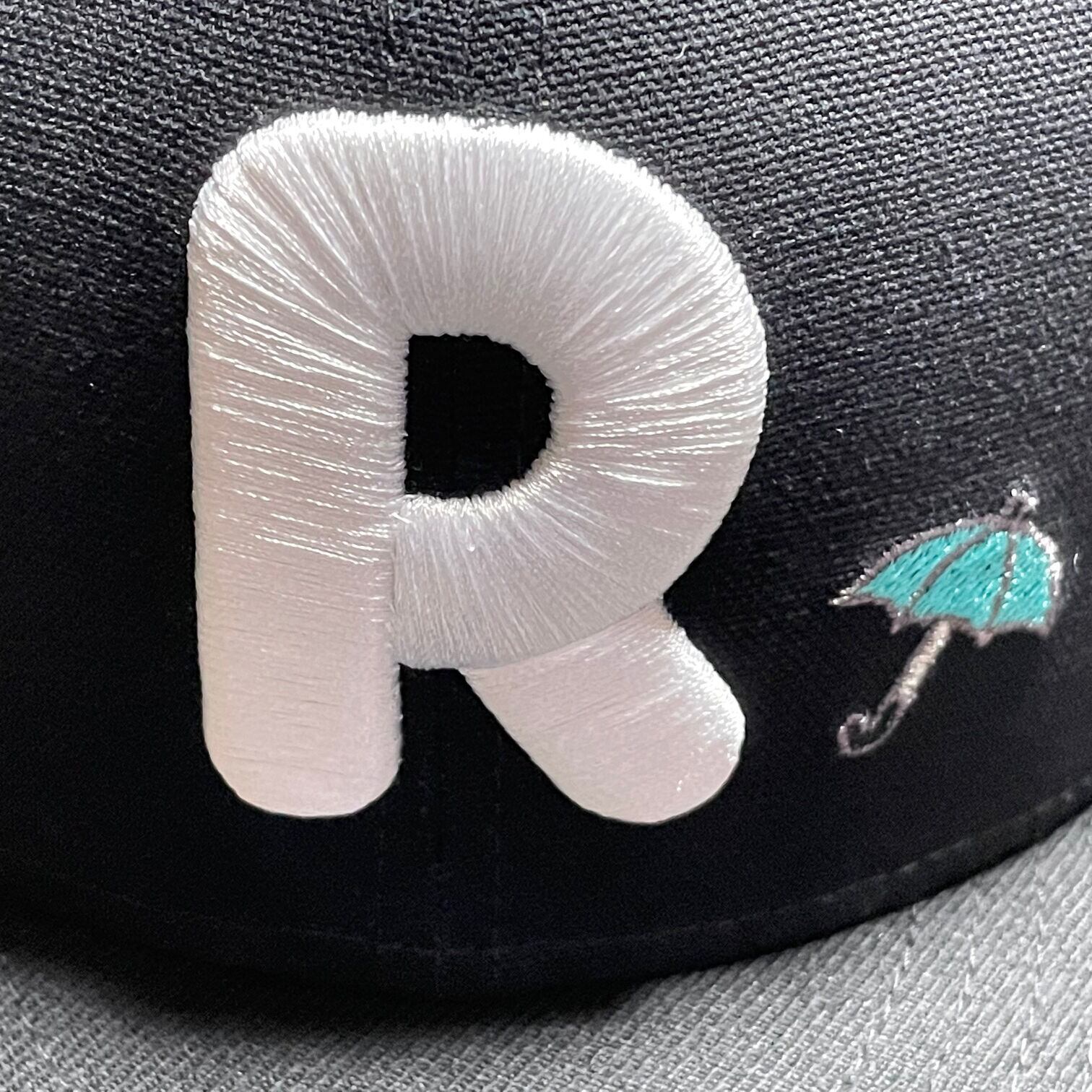 頭文字のRのロゴが正面に入り、横に傘の刺繍が入っております。