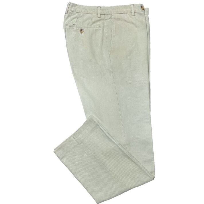 こちらは王道のネイビージャケットにも合わせやすいベージュ色のコットン素材のスラックスとなります。