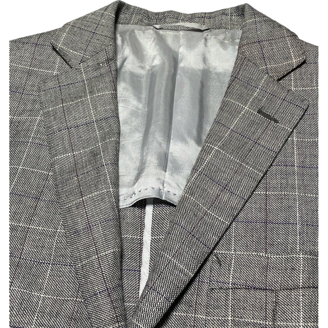 グレー地に異なる2色のパープル色が入ったチェック柄が非常におしゃれで、エルボーパッチやポケットのマチ部分にスエード調のブラウン生地をあしらうなど細部までこだわった一品です。