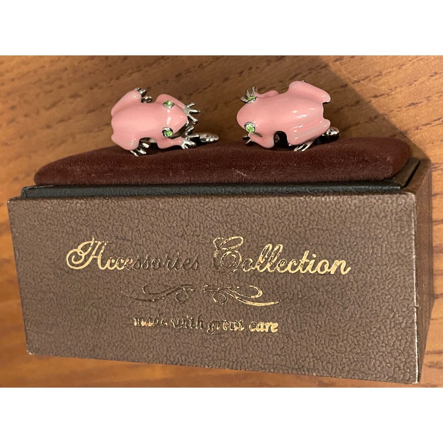 ピンク色のカエルの目の部分がグリーンの宝飾が付いているおしゃれな一品です。