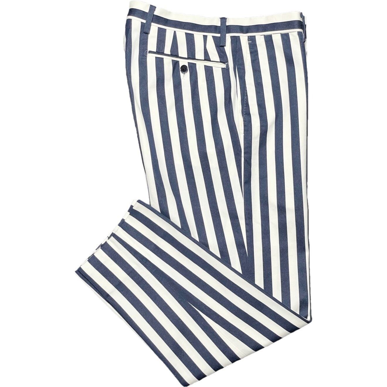 こちらは爽やかなネイビーとホワイトのストライプ柄のコットンスラックスです。