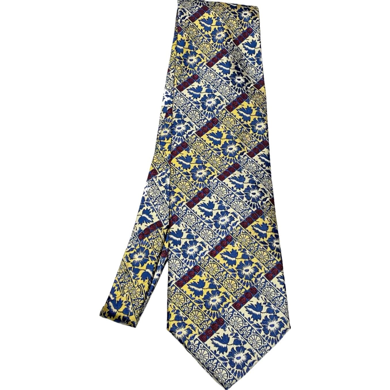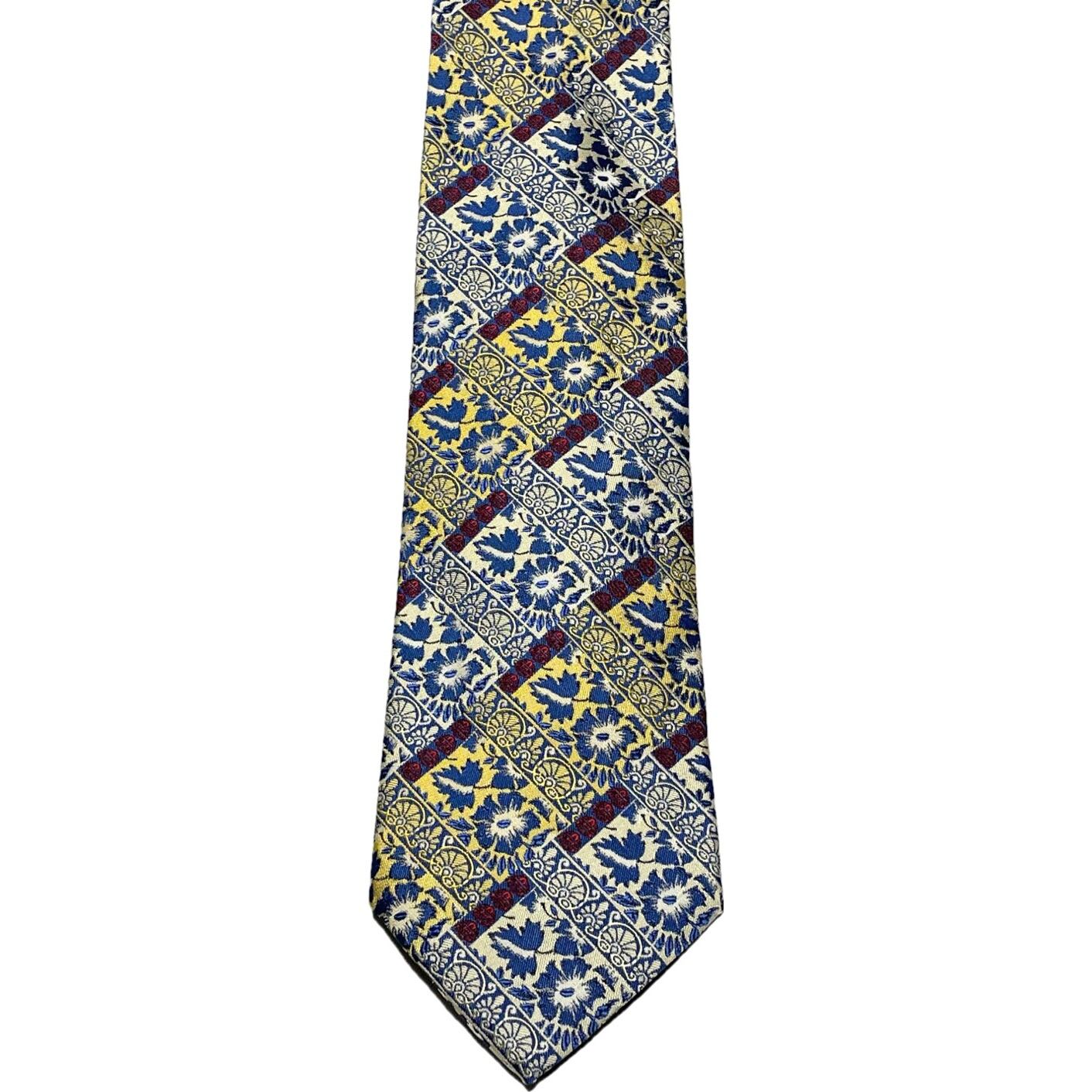 MADE IN ITALY製 GIANCARLO CECCONI ジャガード織り総柄シルクネクタイ ブルー×イエロー