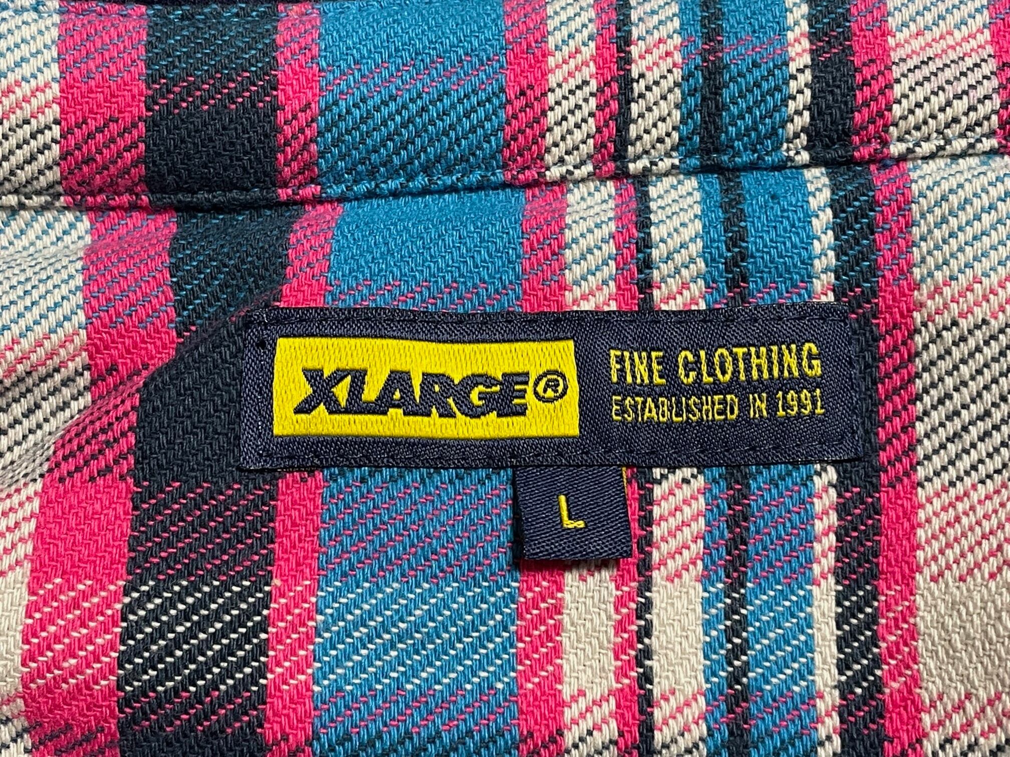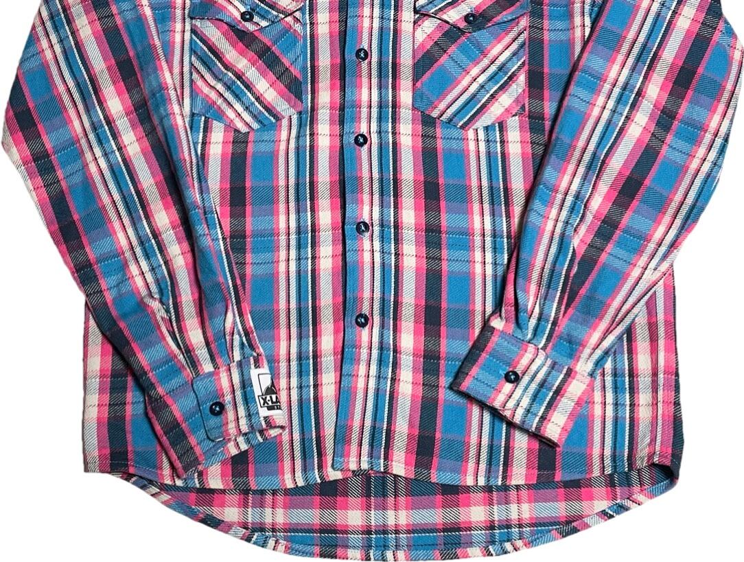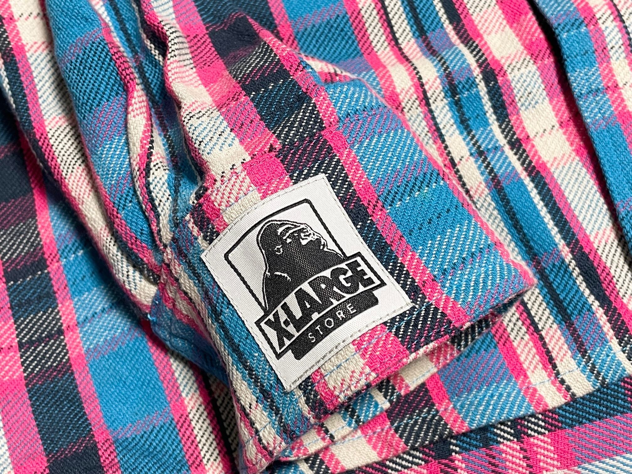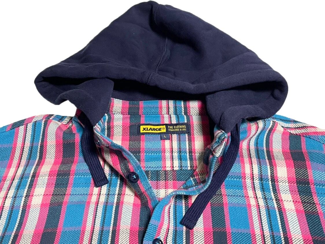 XLARGE フード付きチェック柄ネルシャツ ピンク×ブルー Lサイズ