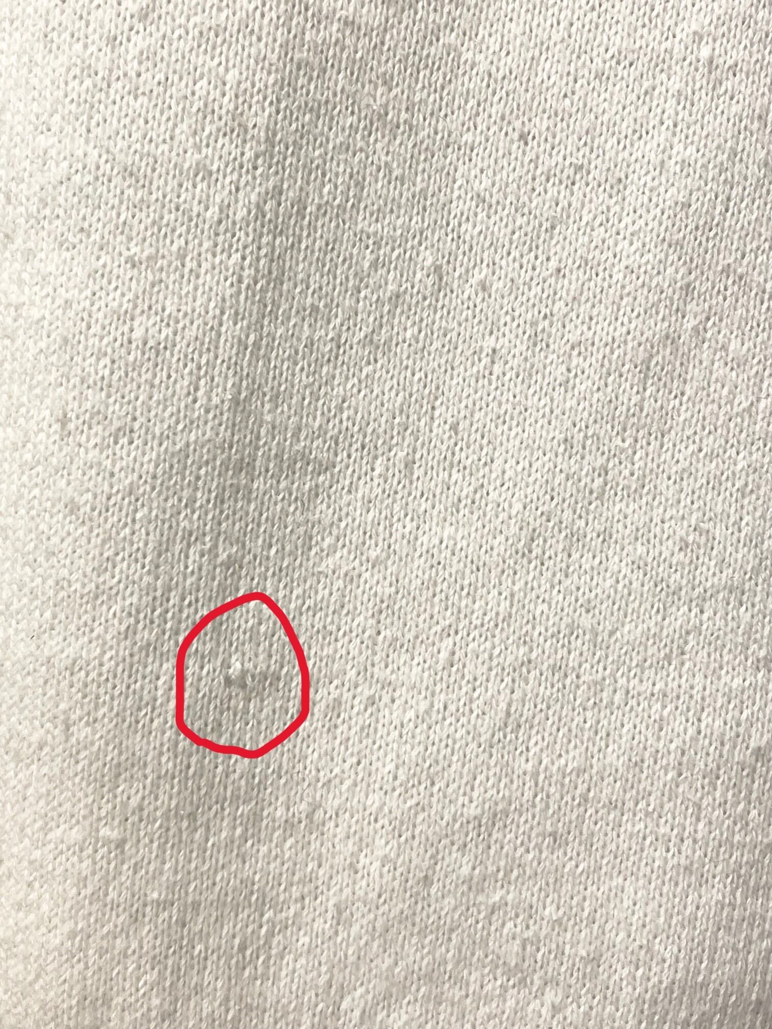 目立ちませんが前身頃の赤丸部分に小穴を補修した跡があるので少し安価での販売となります。