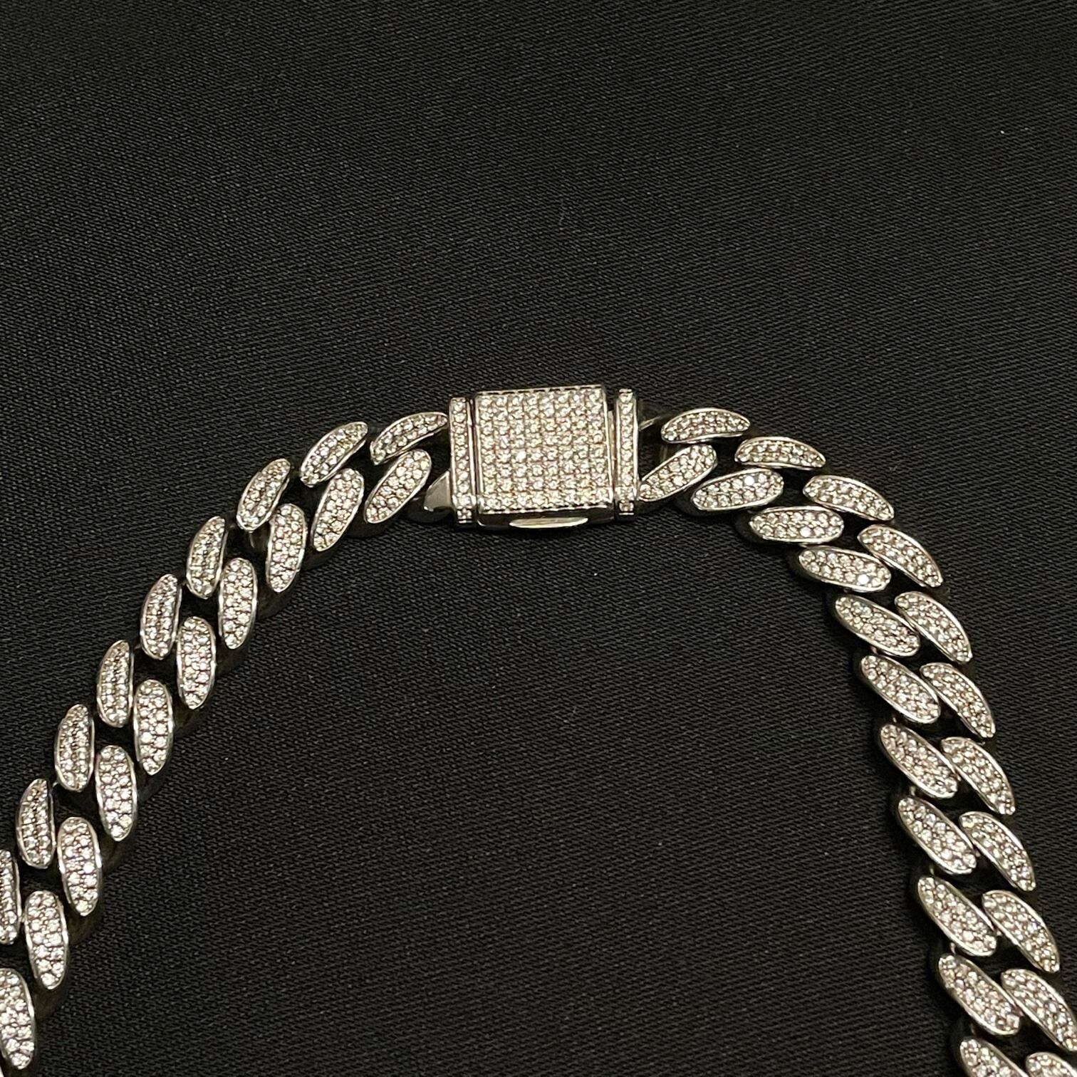 こちらは有名ラッパーなどが愛用しているジルコニアの付いたマイアミキューバンモデルで、少し短めの46cmの長さにしっかりと存在感のある10mm幅タイプで、重さも100gを超えているので重量感もバッチリございます。