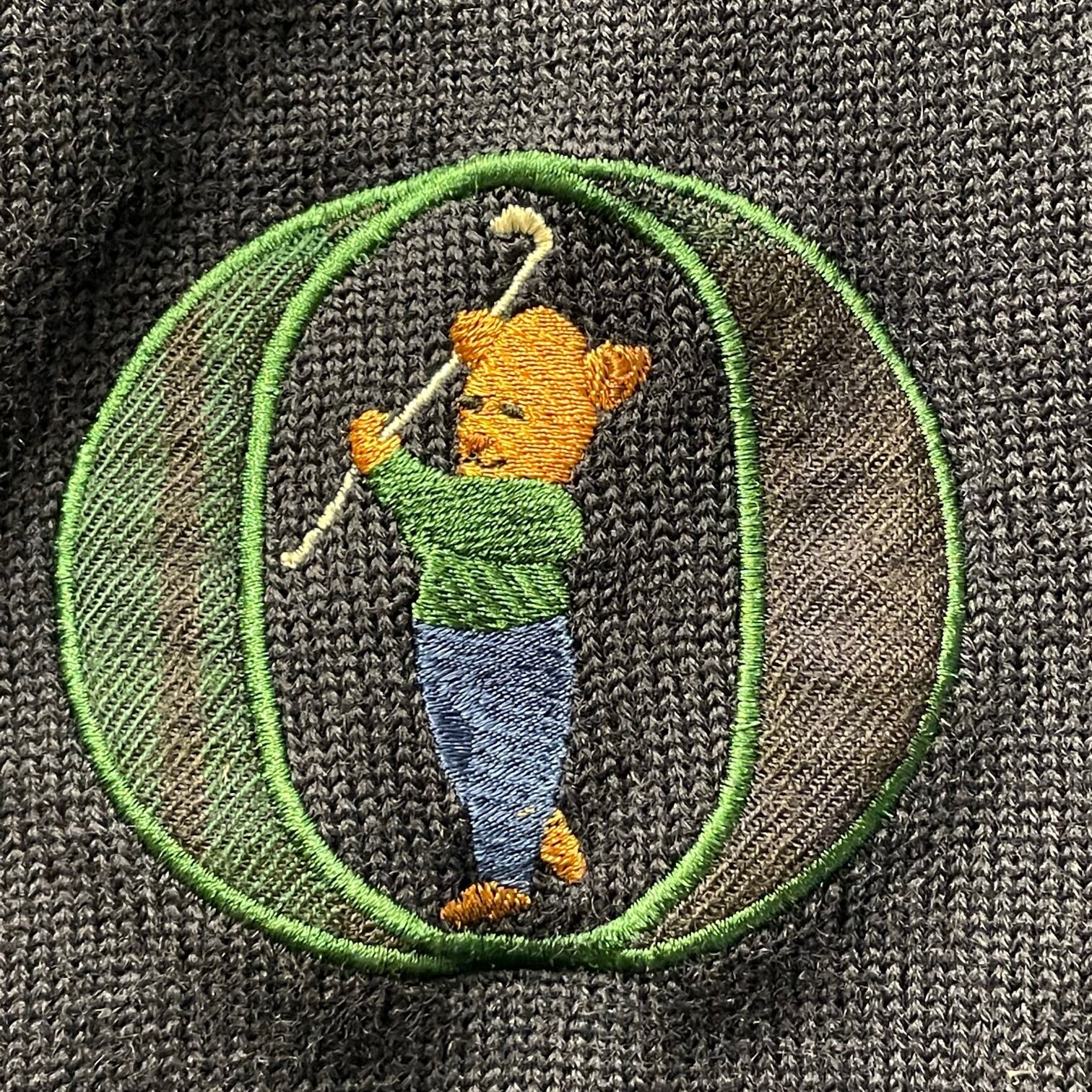 チェック柄のGOLFの文字の横にゴルフ姿の熊が刺繍されたかわいいデザインのおすすめの一品です。