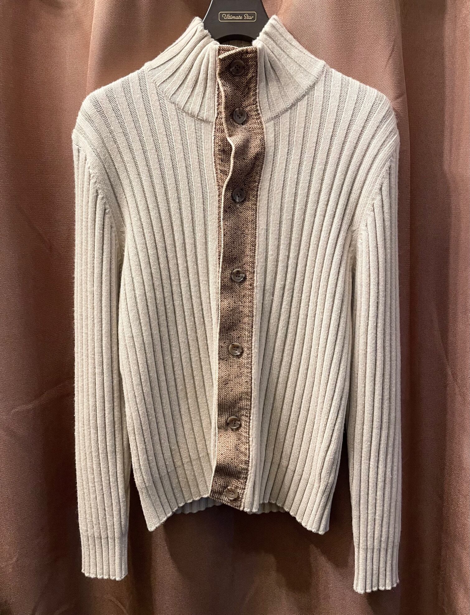 こちらは前立ての別布がアクセントになったボタン仕様のニットカーディガンになります。
