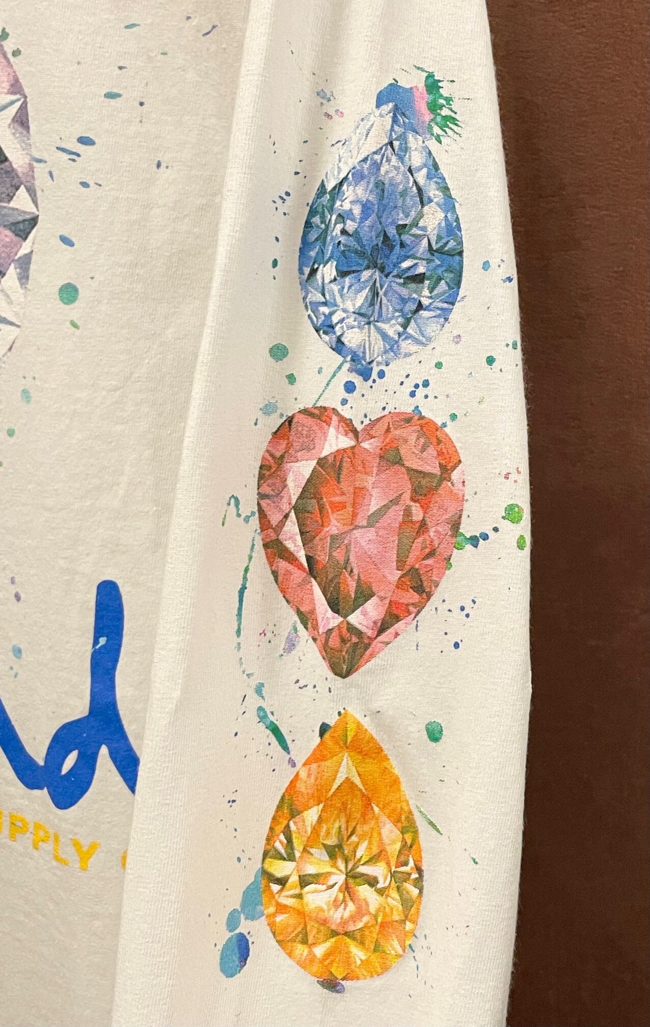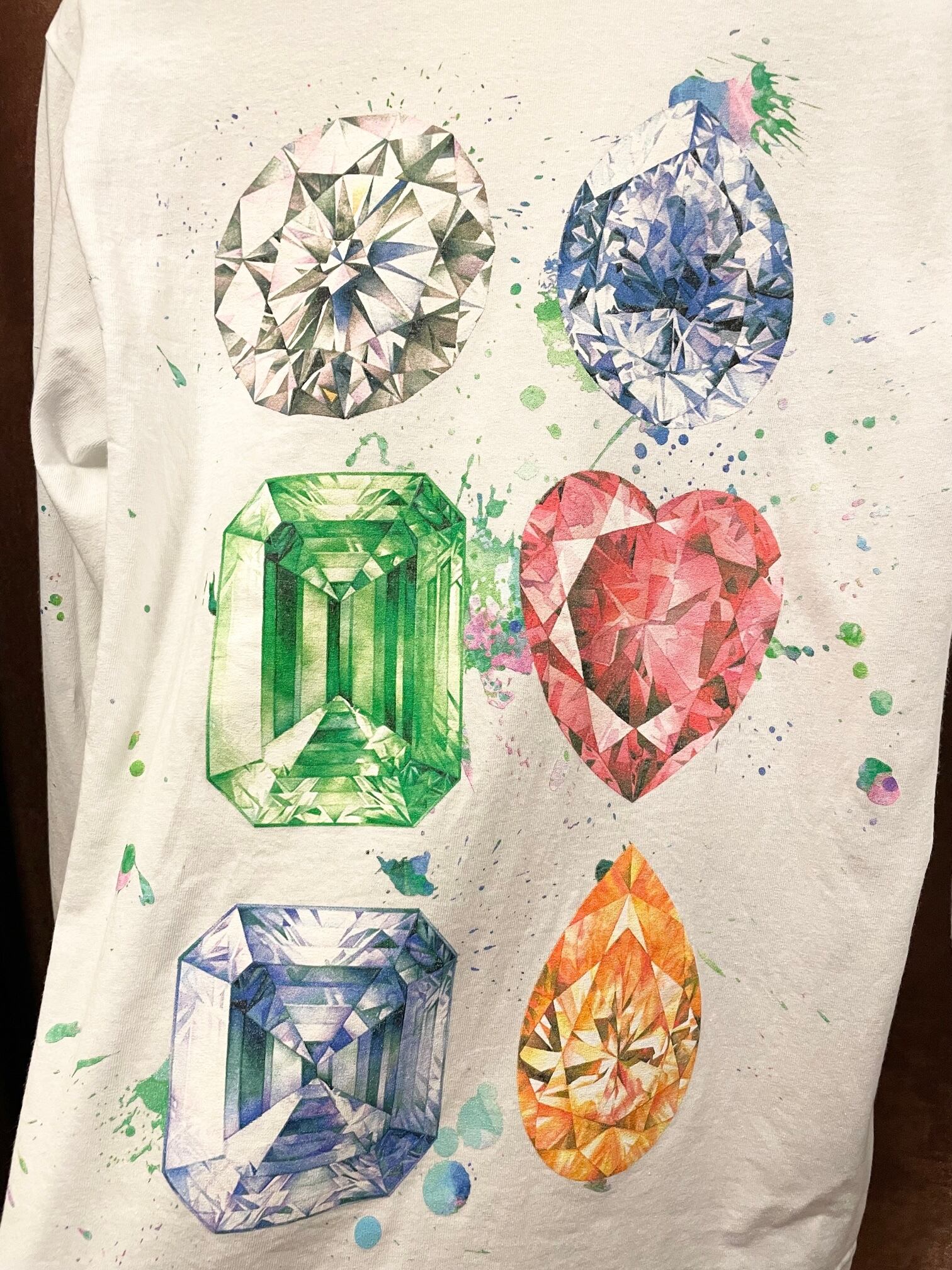 正面はダイヤモンドとペンキ加工のようなデザインで、両袖に宝石がプリントされており、両袖の宝石が背面に全てプリントされた爽やかなホワイトボディに映えるカラフルなカラーリングが特徴的なおすすめの一品です。