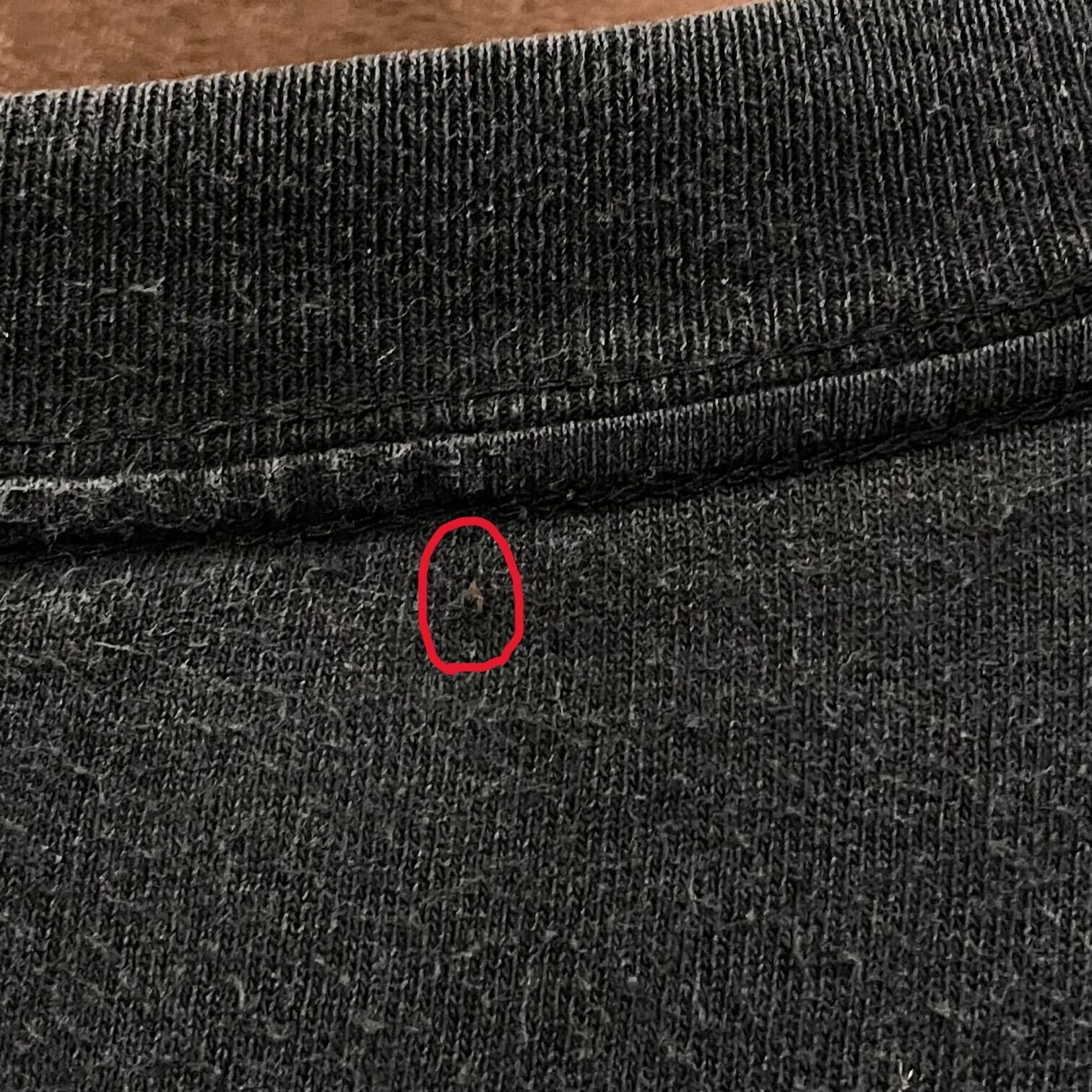 古着慣れしている方であれば問題ないと思いますが、首裏付近の赤丸部分に小穴があるのと左袖裏にペンキみたいな跡が付いている為、市場価格より安価での販売となります。