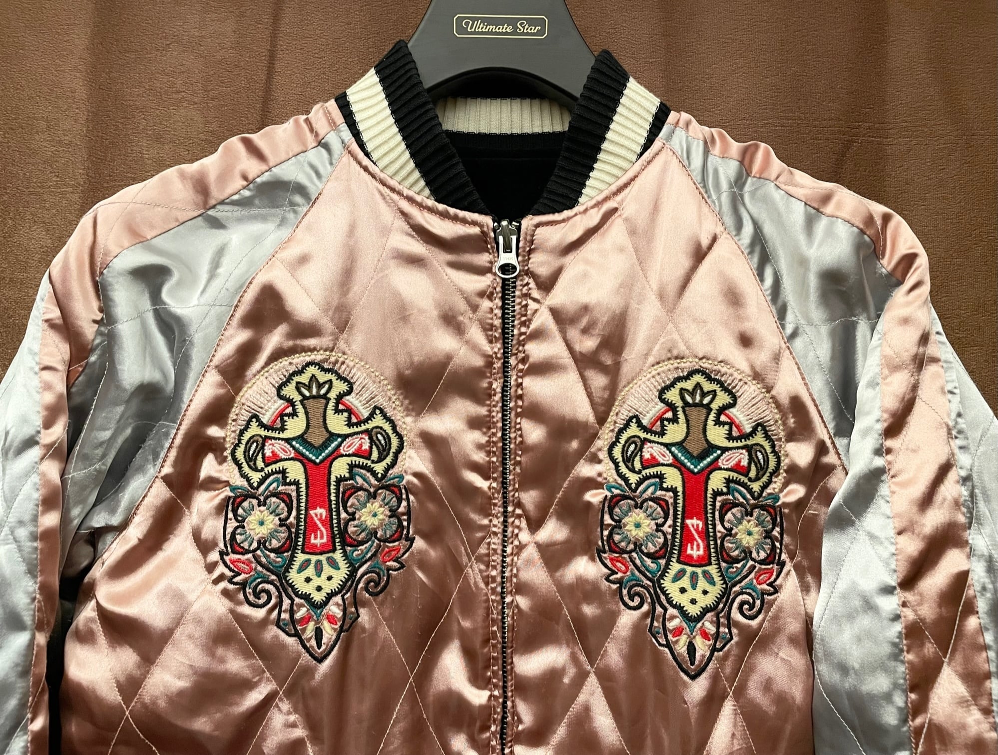 スカジャンには両胸にクロス(十字架)モチーフのオリジナルデザインの刺繍が入り、背面には伝説のラッパーBiggie Smalls(ビギ―・スモール)がラッパー名で使っているNotorious B.I.G. (ノトーリアス・B.I.G.)のNotorious(悪名高い)とSWAGGERを組み合わせた「The Swagger Notorious」の文字が刺繍されております。