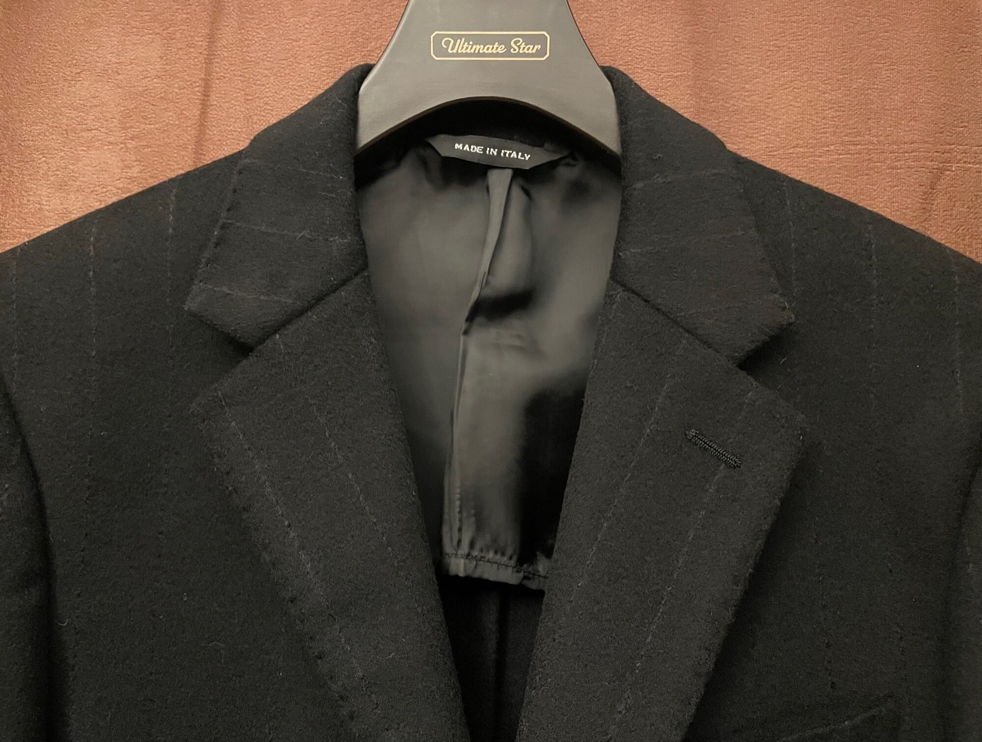 厚手のウール生地はシャドーストライプ柄になっており、近くで見るのと遠くで見るので違う表情を与えてくれるおすすめの一品です。